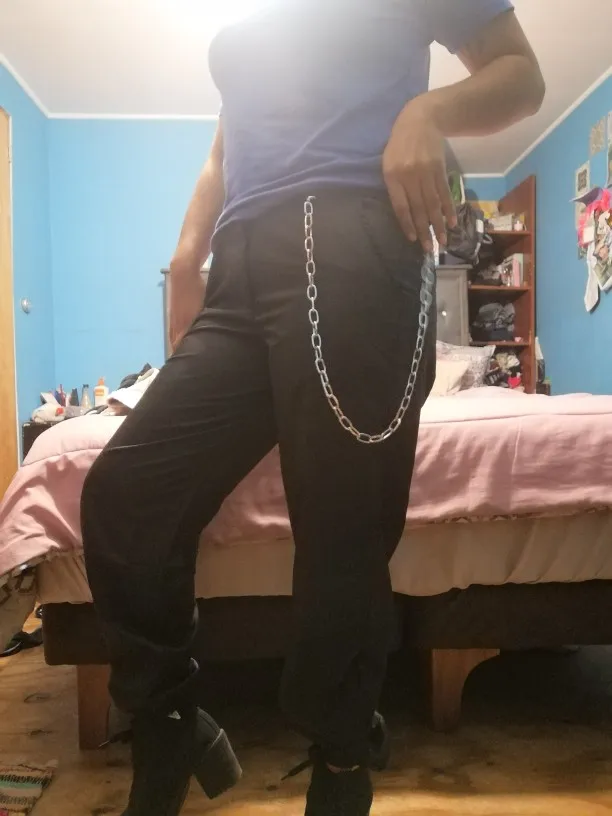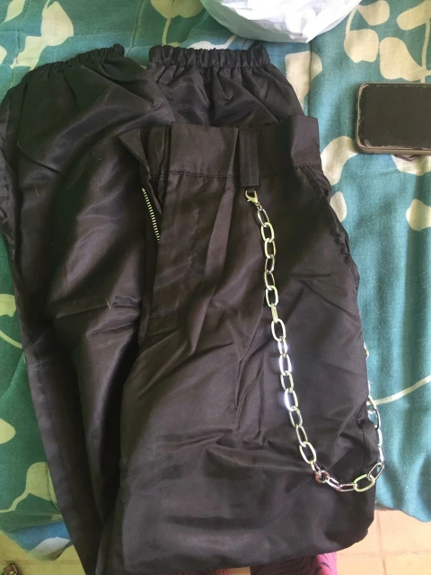 Он прибыл идеально с цепью. Тип ткани брюк свежий, но выглядит как пластик. Но это хорошо для лета и т. д.