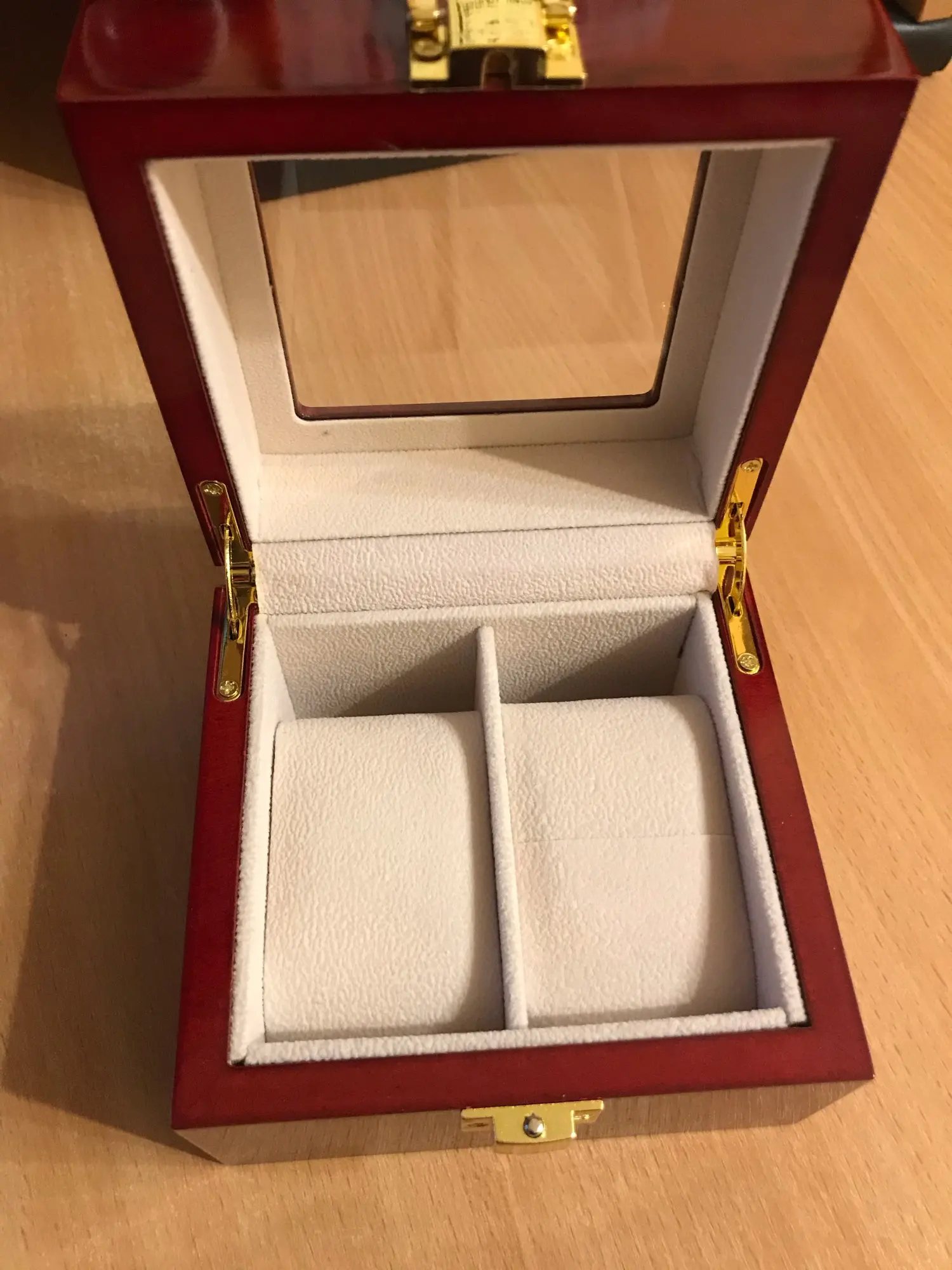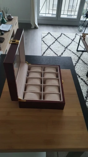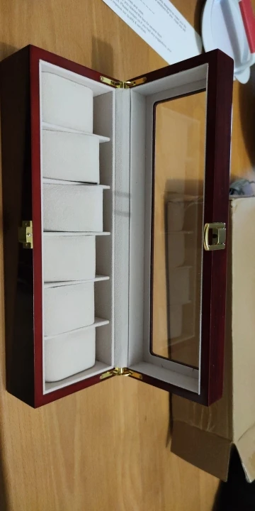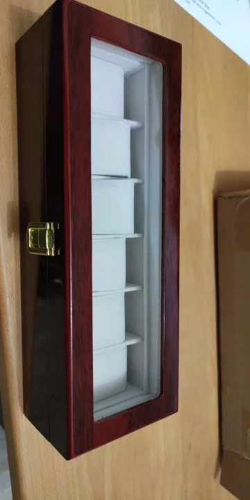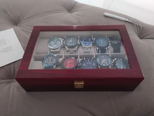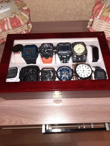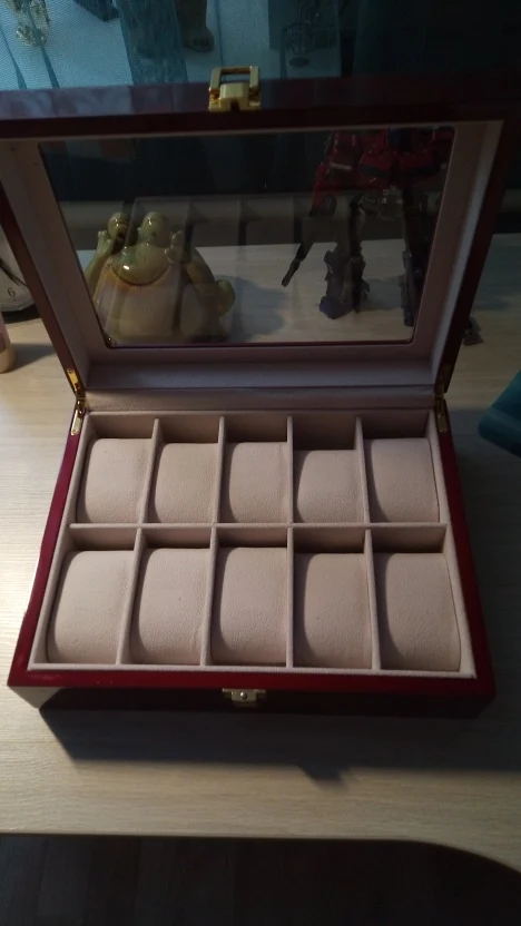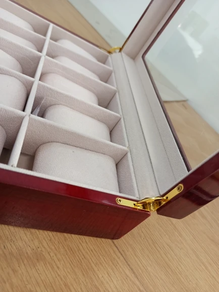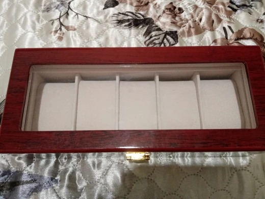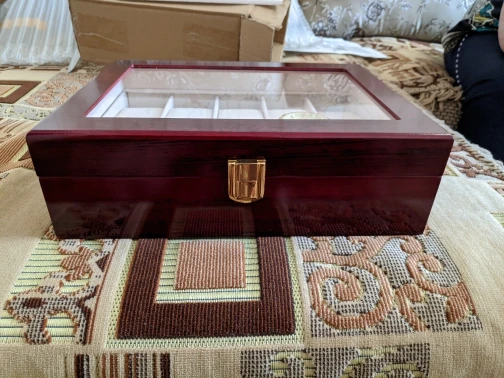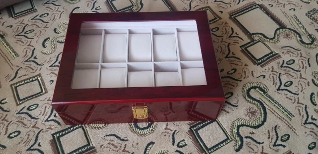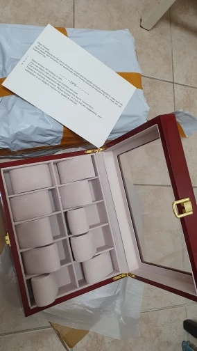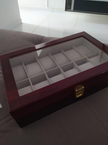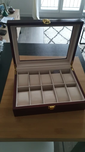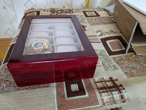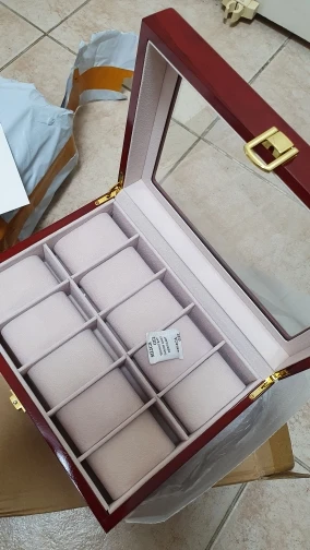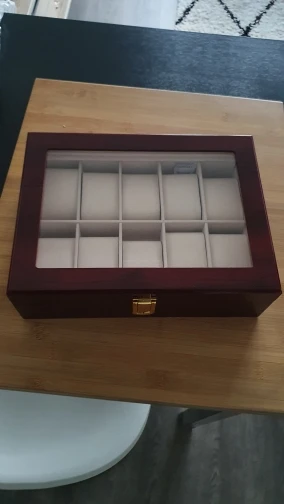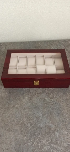 Хорошая коробка. Мне нравится вид печенья и отделка. Одна из петель воблер, но это не имеет большого значения. Это точно так же, как рекламируется. Стекло при доставке было очень хорошим и чистым. Это моя вина, что сейчас он выглядит грязным, а не вина производителя или продавца. Я доволен покупкой. Я бы порекомендовал, если вам нужно хранилище для ваших часов.