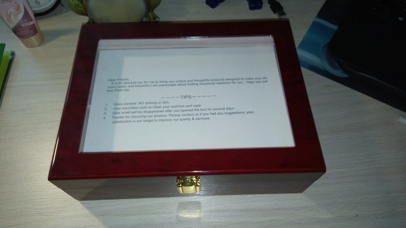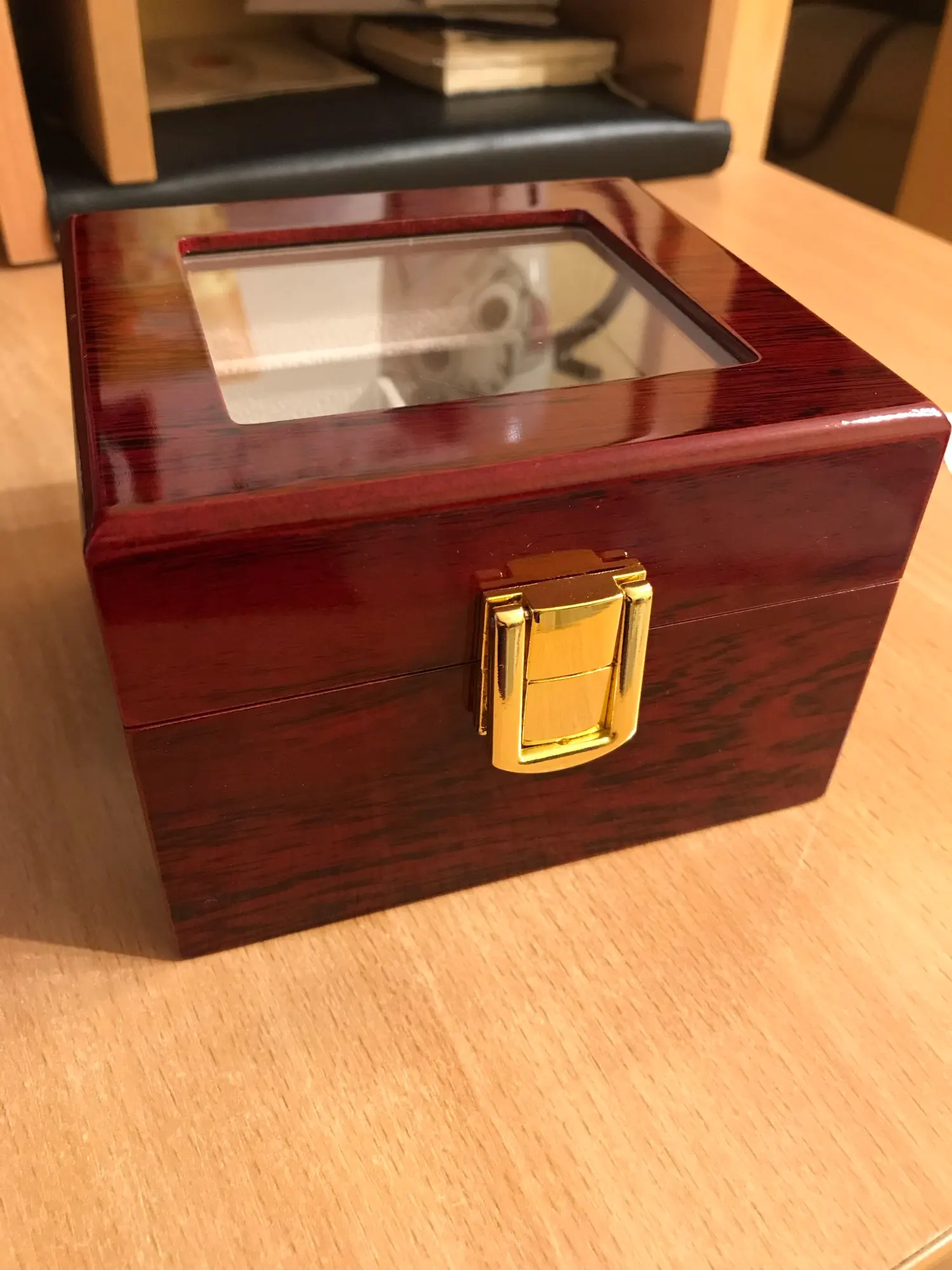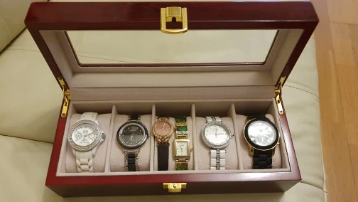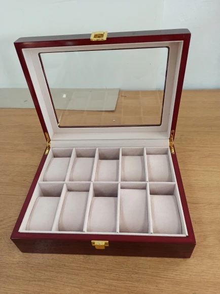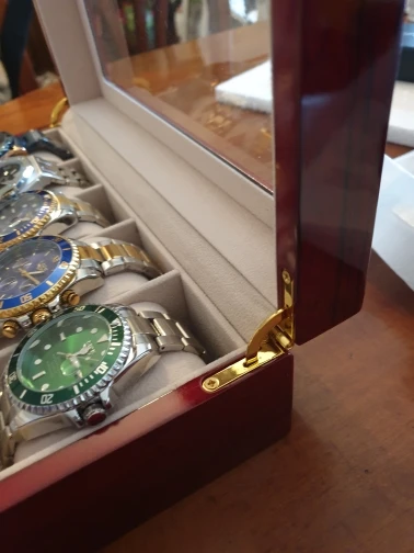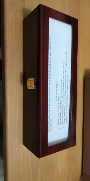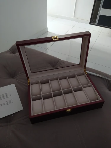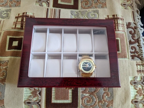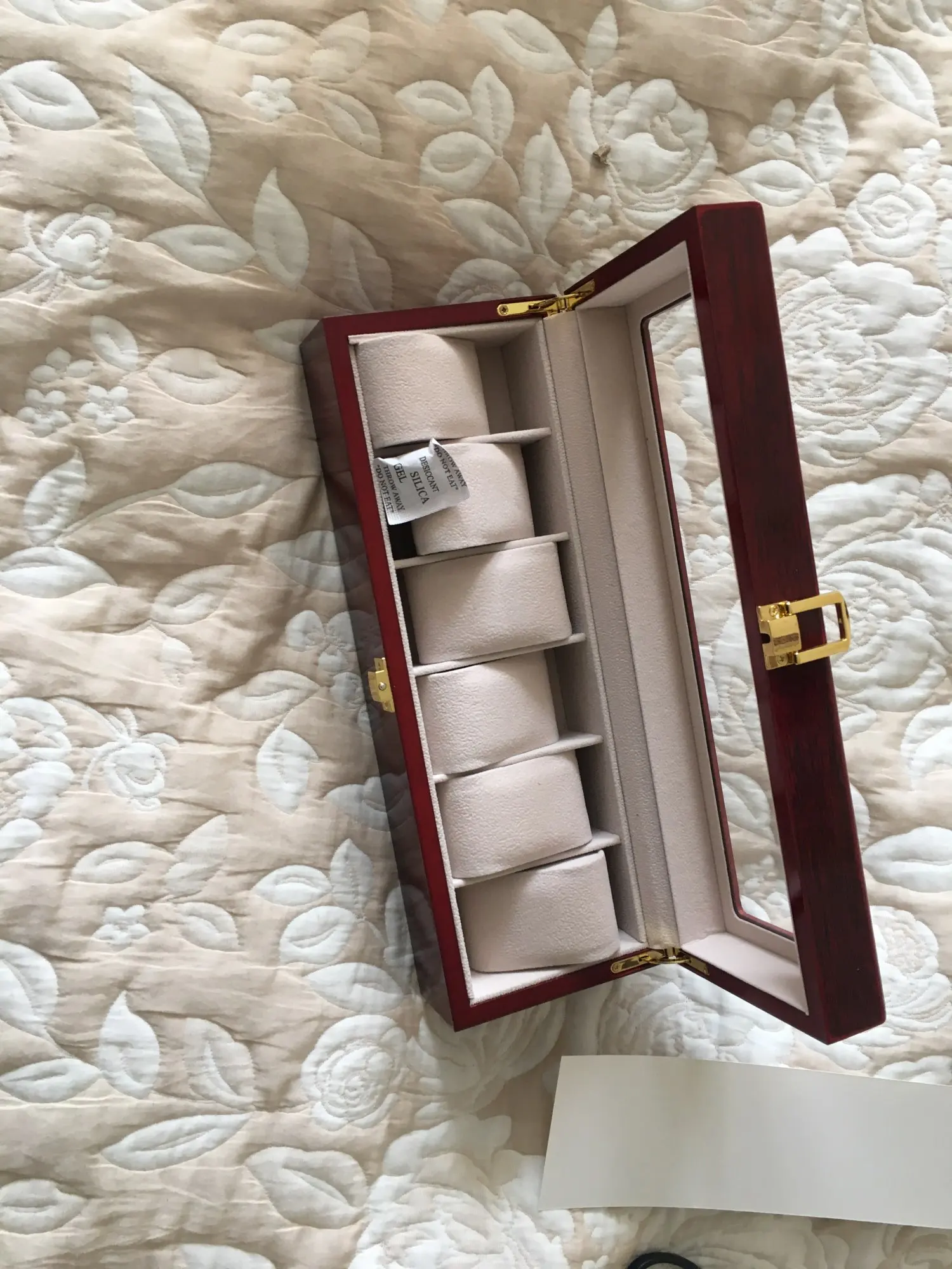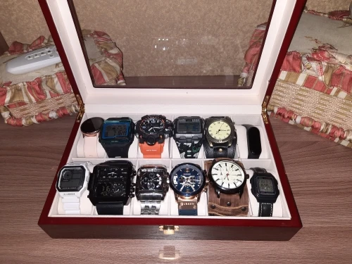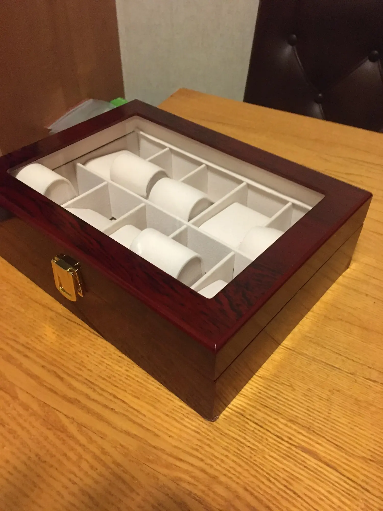 Хорошая коробка. Мне нравится вид печенья и отделка. Одна из петель воблер, но это не имеет большого значения. Это точно так же, как рекламируется. Стекло при доставке было очень хорошим и чистым. Это моя вина, что сейчас он выглядит грязным, а не вина производителя или продавца. Я доволен покупкой. Я бы порекомендовал, если вам нужно хранилище для ваших часов.