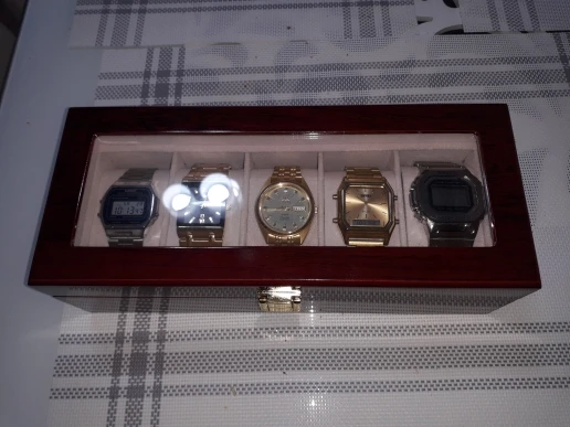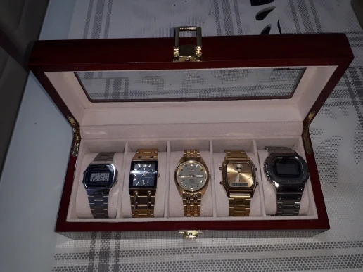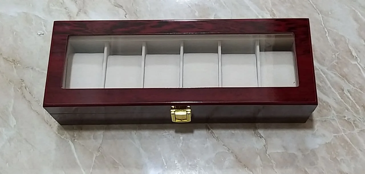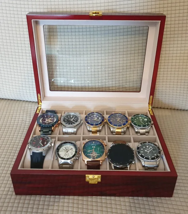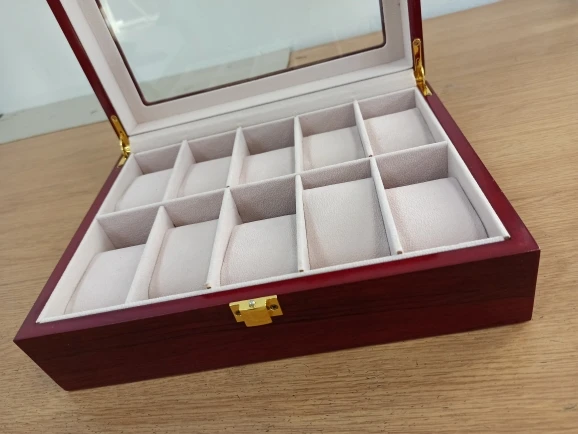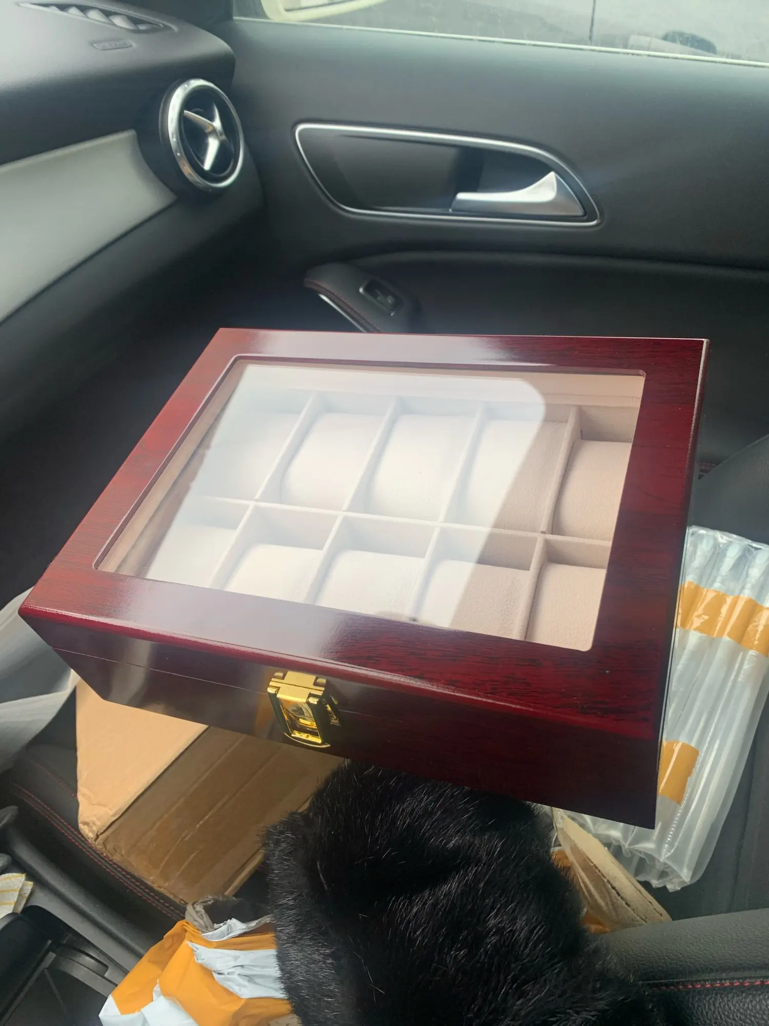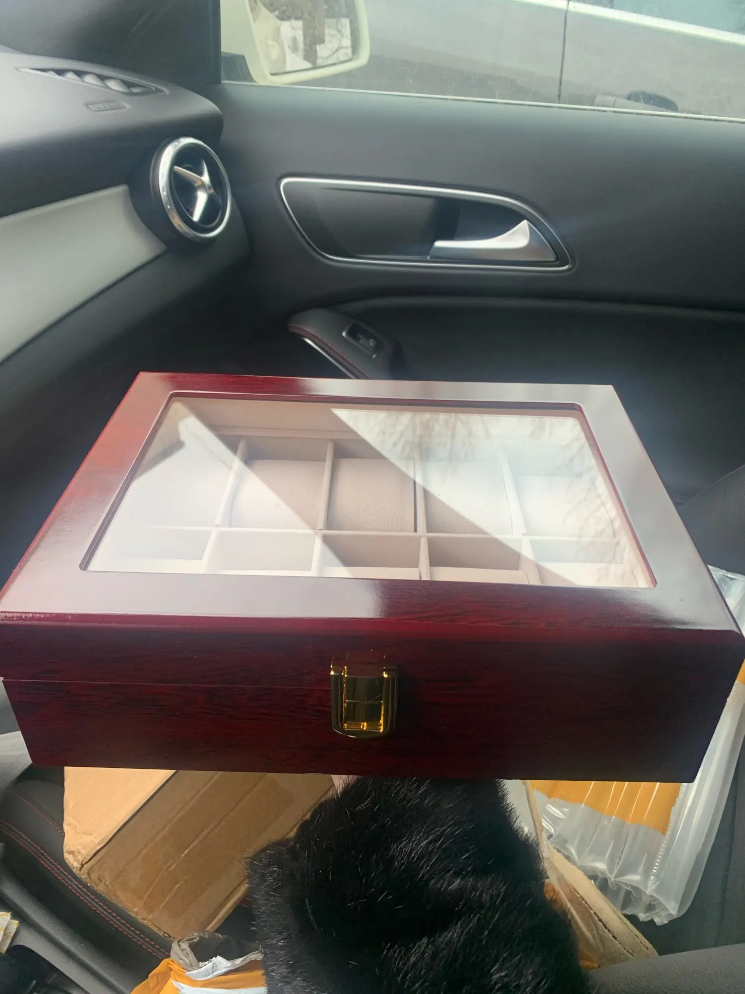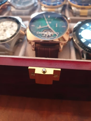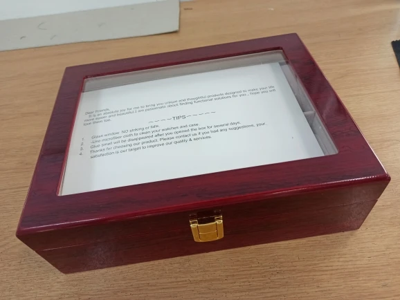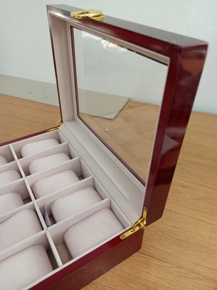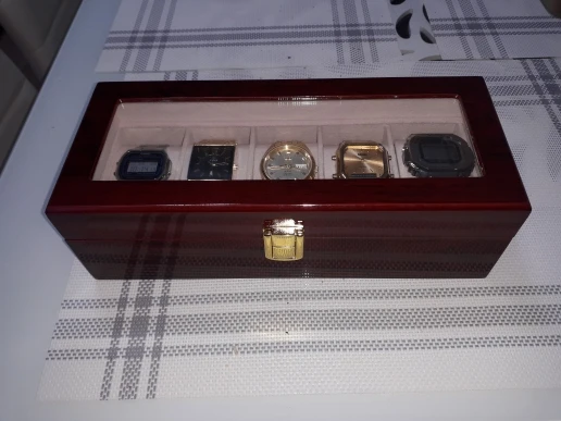 Хорошая коробка. Мне нравится вид печенья и отделка. Одна из петель воблер, но это не имеет большого значения. Это точно так же, как рекламируется. Стекло при доставке было очень хорошим и чистым. Это моя вина, что сейчас он выглядит грязным, а не вина производителя или продавца. Я доволен покупкой. Я бы порекомендовал, если вам нужно хранилище для ваших часов.