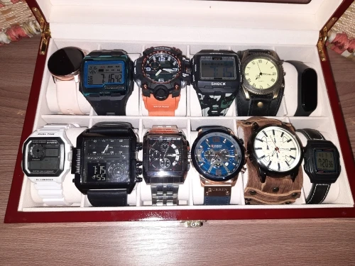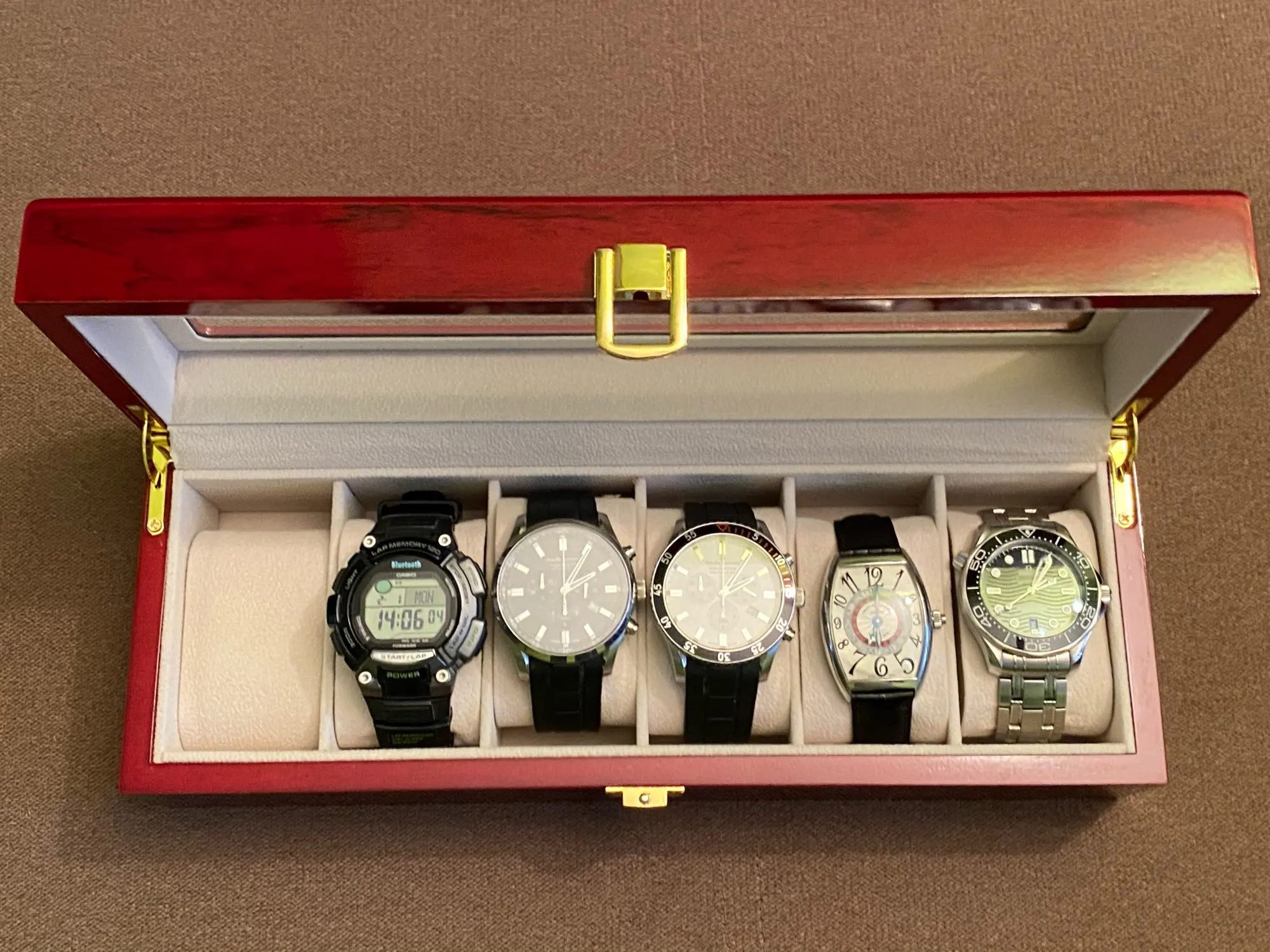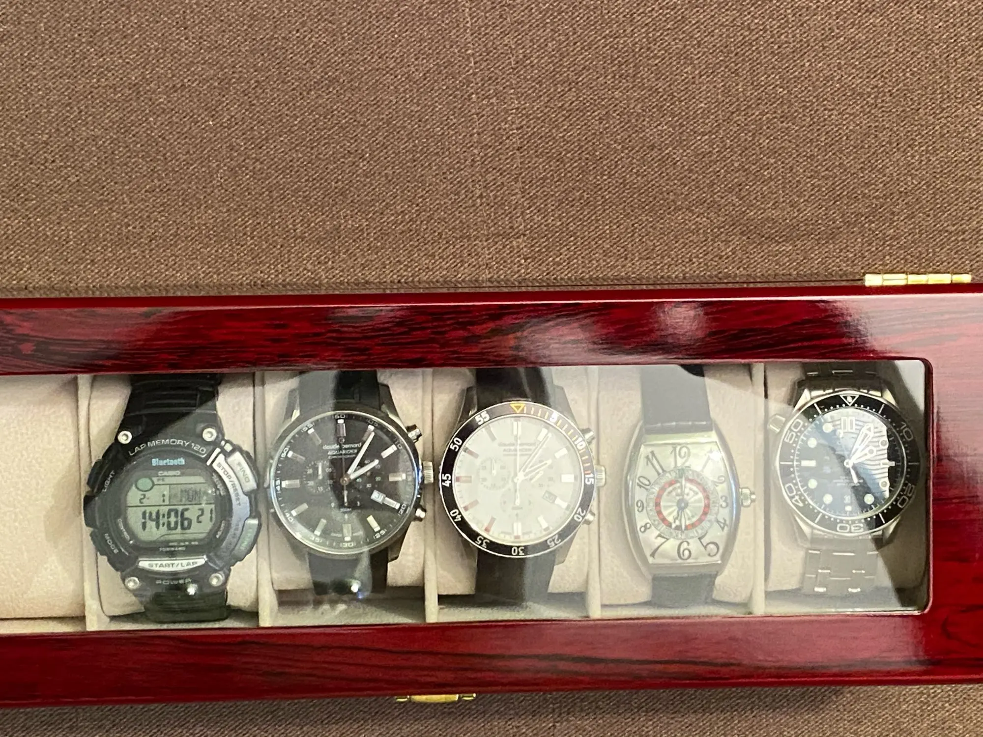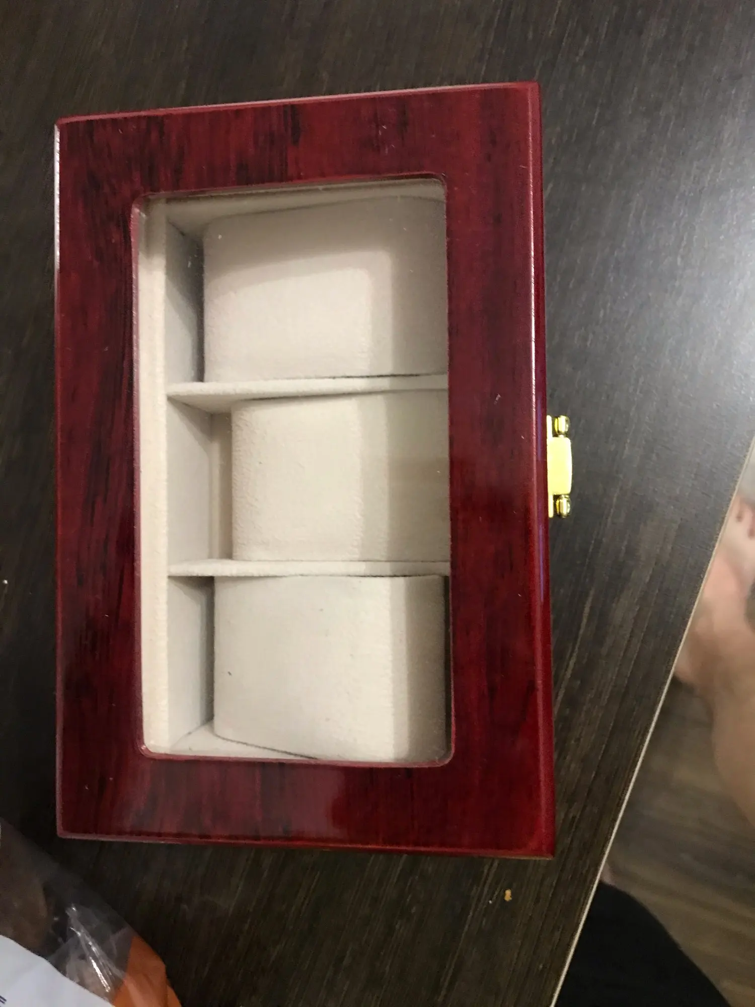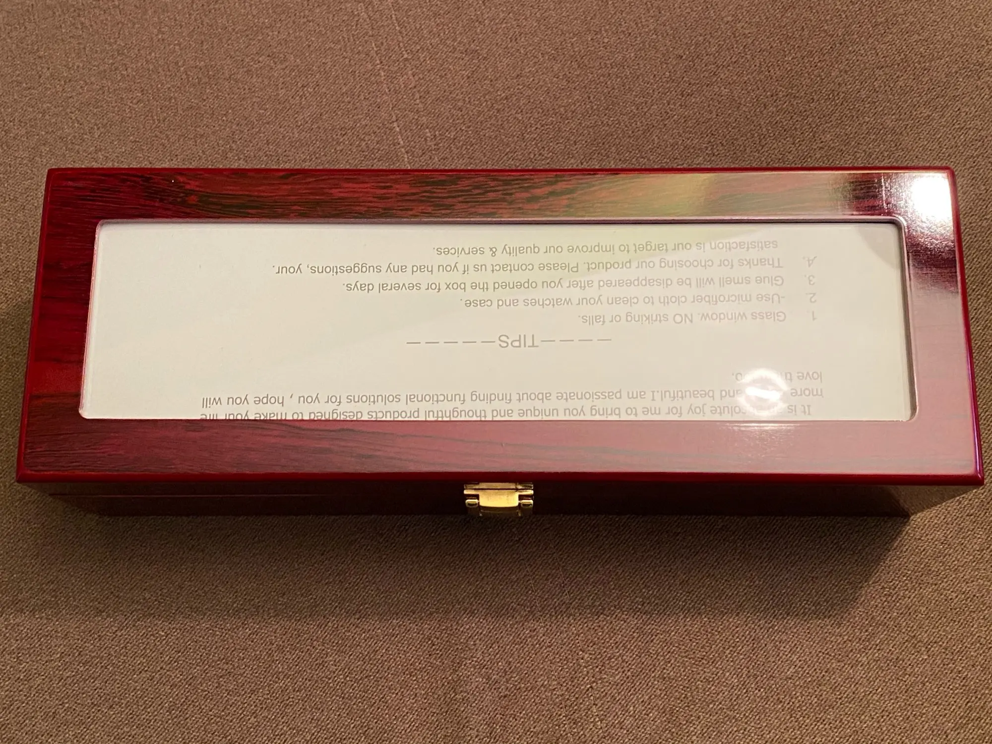 Хорошая коробка. Мне нравится вид печенья и отделка. Одна из петель воблер, но это не имеет большого значения. Это точно так же, как рекламируется. Стекло при доставке было очень хорошим и чистым. Это моя вина, что сейчас он выглядит грязным, а не вина производителя или продавца. Я доволен покупкой. Я бы порекомендовал, если вам нужно хранилище для ваших часов.