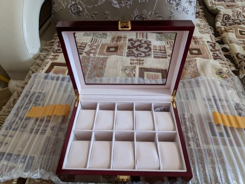 Органайзер для часов прибыл в очень добросовестно и надежно упакованном виде. Качество товара очень-очень хорошее! Изделие цвета красного дерева, гладкое и хорошо отполировано. Выглядит очень стильно и дорого. Низ изделия обшит тканью типа замши, которая не царапает мебель. Я очень довольна покупкой! Рекомендую продавца!