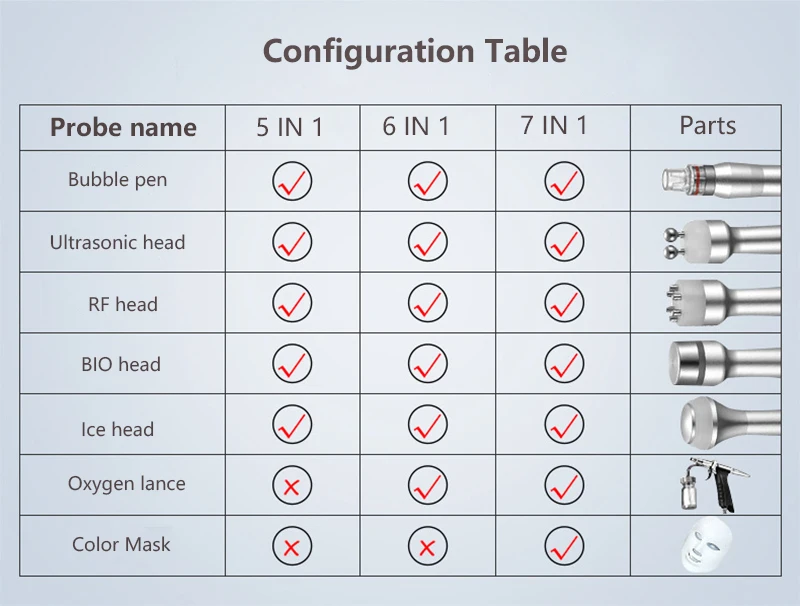 1. Ручка для очистки пузырьков:В богатой кислотной среде углекислого газа снижают значение PH в клетке, внутриклеточное кровообращение с гемоглобином и снижают способность, известную как: Bohr эффект, может улучшить кровообращение, увеличить содержание кислорода в крови, ускоряет метаболизм клеток кожи.2. БИО ручка:Подтяните мышцы глаз, усиливайте гибкость мышц глаз, чтобы текст окончания потери глаз, сумки для глаз, очки снимали усталость, уменьшали темные круги3. RF ручка:Продвижение фибробластов производит Восстановленный коллаген, делая кожу более упругой, гладкой и без морщин текстуру кожи.4. Ультразвуковая Ручка:Использование высокочастотного ультразвука на коже 1 Гц внутренние стимуляторы вибрации, в результате чего тепид приводит к улучшению метаболизма клеток кожи и способствует циркуляции крови, В то время как нижняя часть продукта входит в кожу, улучшает способность кожи удерживать влагу, очищает поры и улучшает состояние кожи.5. Холодный молоток:Энергия холодного молотка, воздействующая на кожу, поры кожи, питательные вещества и воду, блокированные в порах, предотвращают потерю влаги и обеспечивают седативный эффект аллергии.