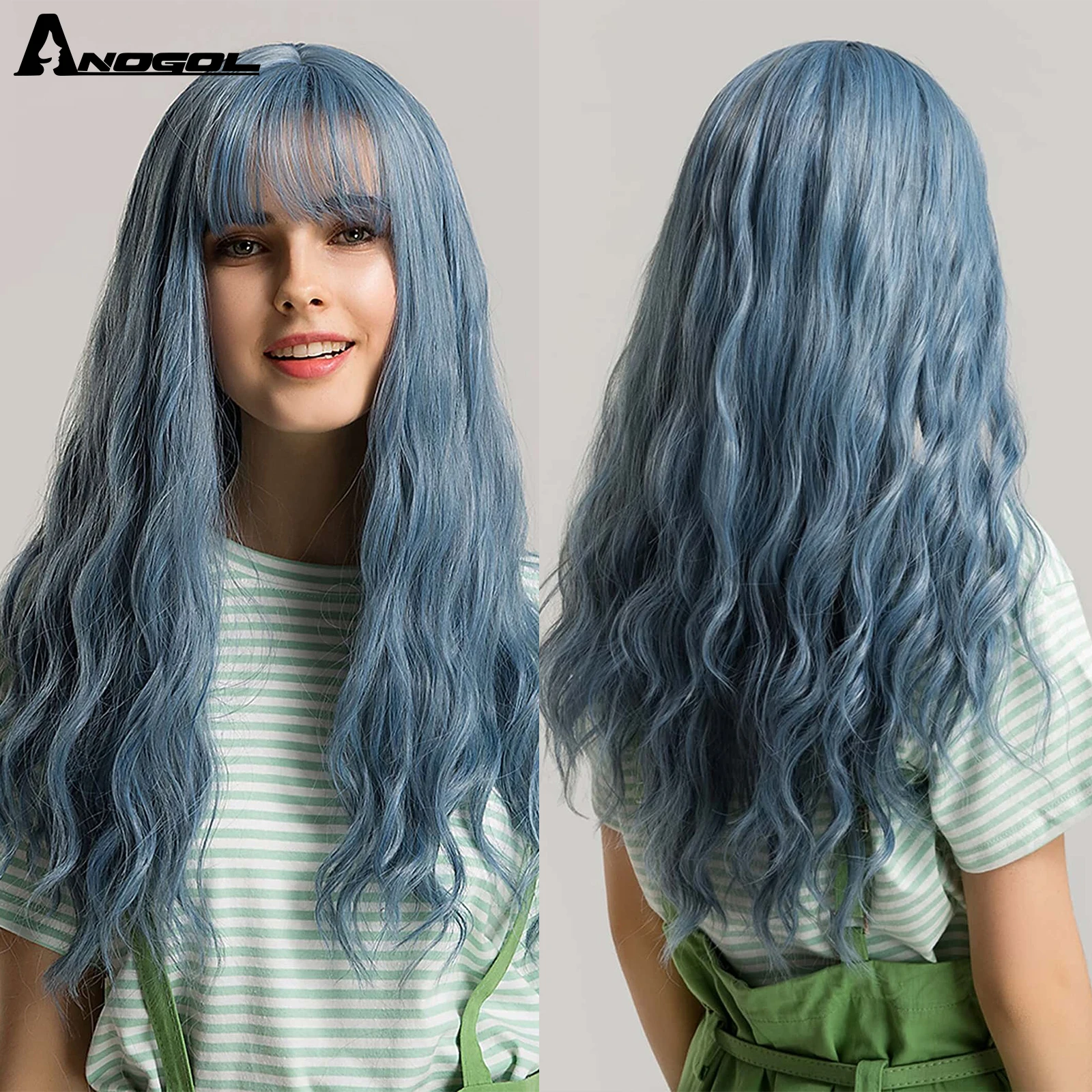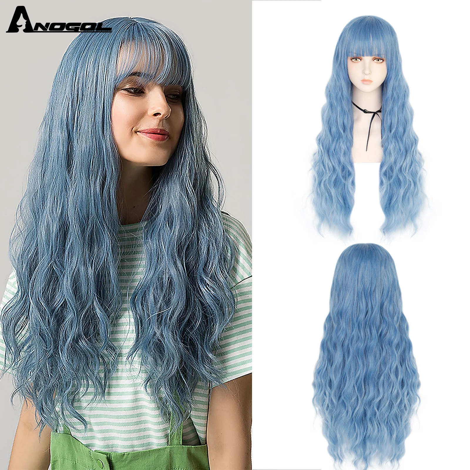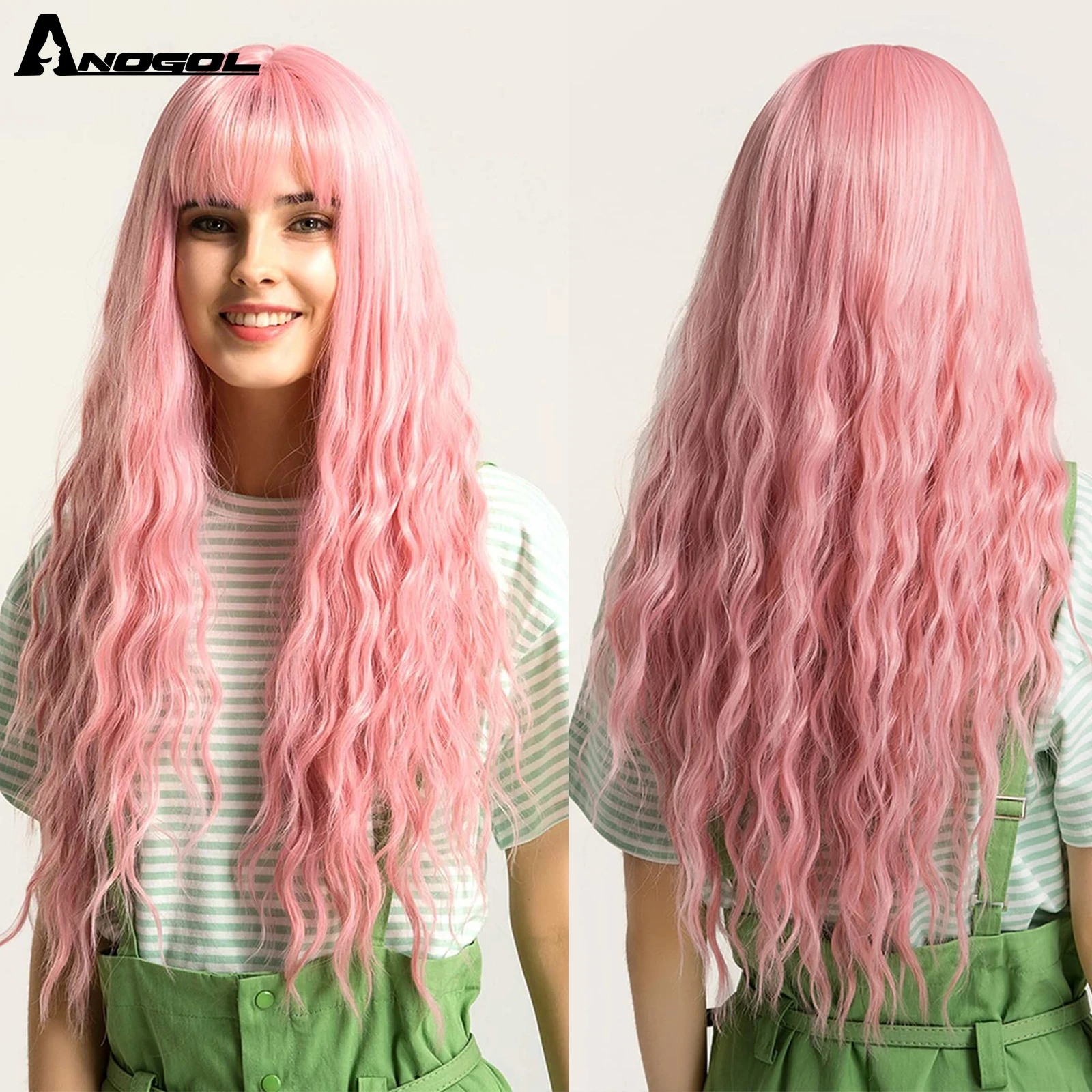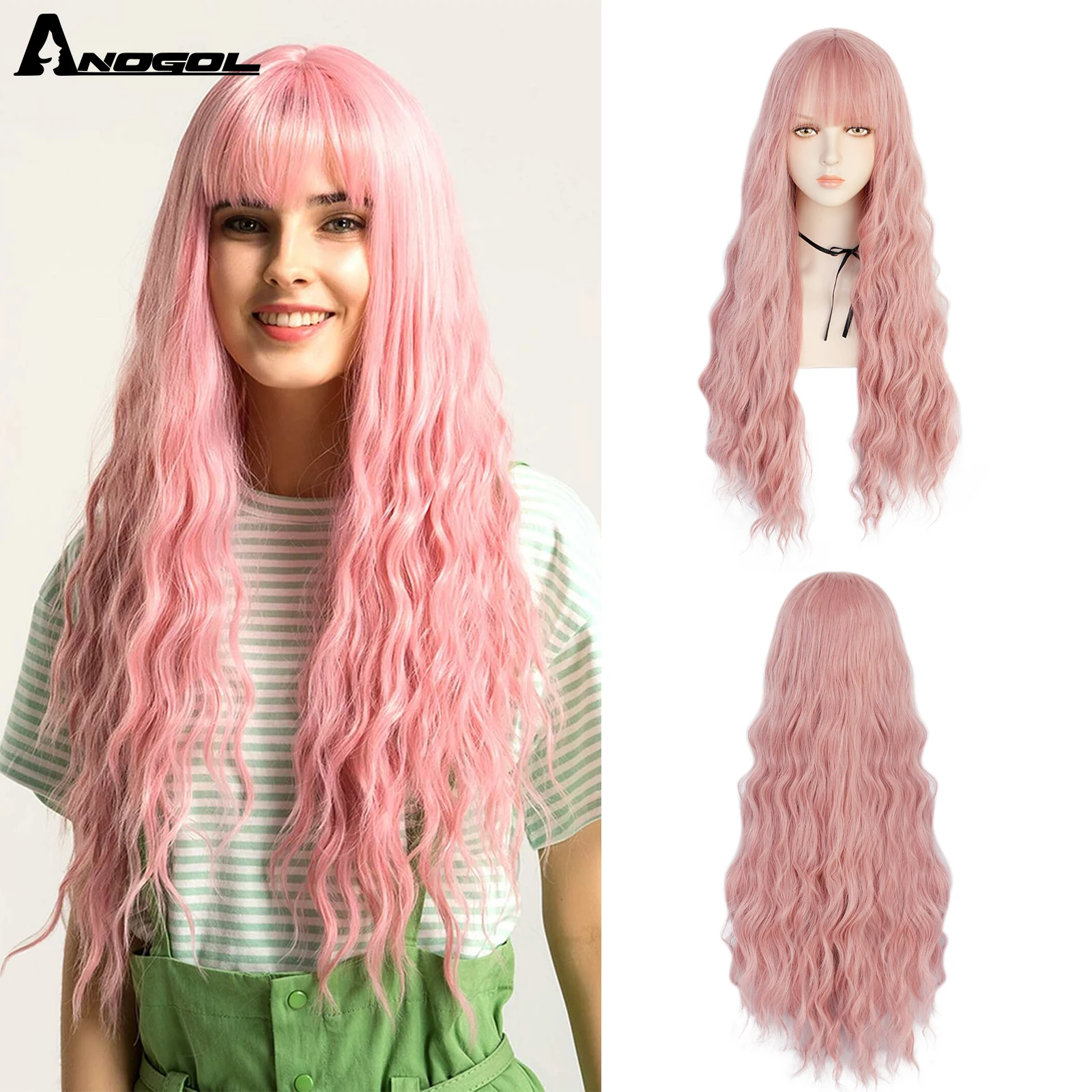 Аногол длинные волнистые волосы парики розовый Золотой Блонд черный синий белый синтетический парик с плоской челкой бахрома для женщин Лолита косплей О доставке: