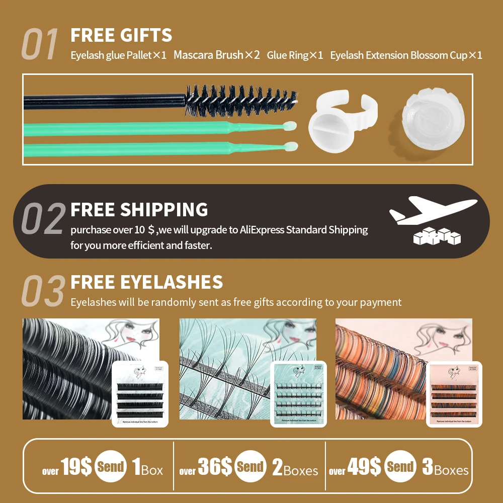 О: бесплатные подарки для всех заказов. B: Вы получите 1 коробку ресниц, если она превышает 19,00 долл. США за заказ. C: Вы получите 2 коробки ресниц, если они превышают 36,00 долларов США за заказ. D: вы получите 3 коробки ресниц, если они превышают 49,00 долларов США за заказ.