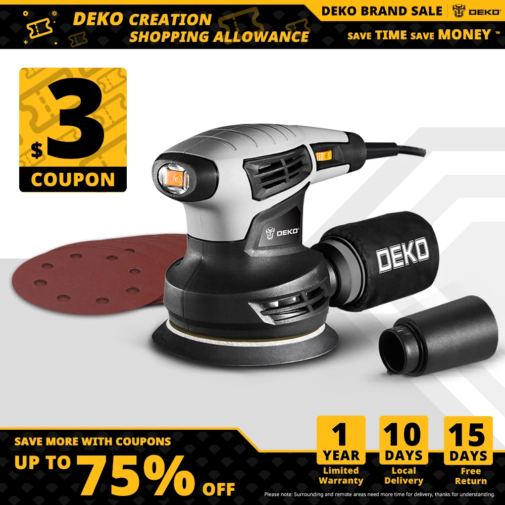 DEKO DKSD28Q1, 280 Вт, случайный выбор орбитальная шлифовальная машина, с 15 листами наждачной бумаги, выхлопом пыли и гибридной канистрой для пыли