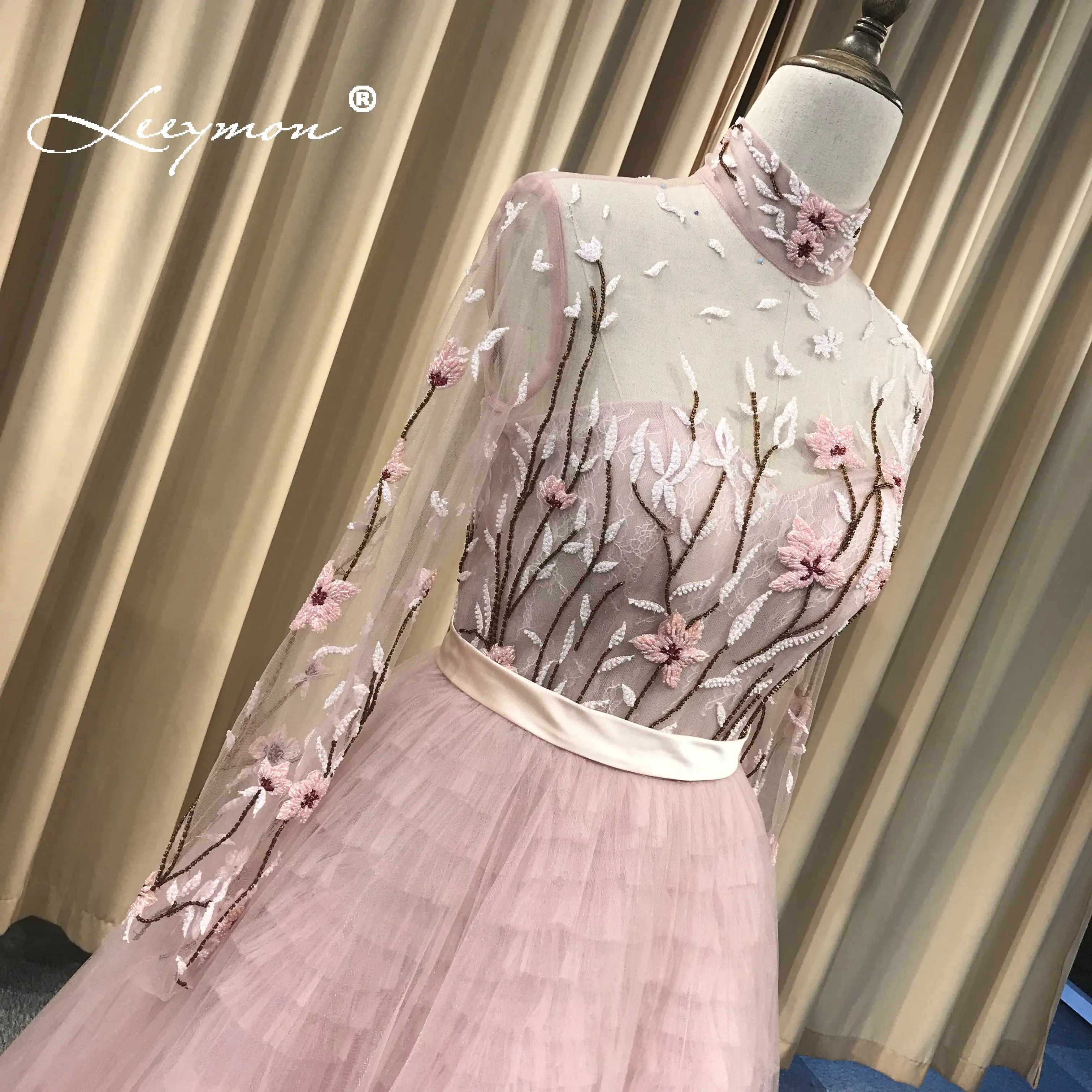 Leeymon Лимонно-розовый A линия вечернее платье с длинными рукавами длина пола кружева бисером высокого класса вечернее платье вечернее платье