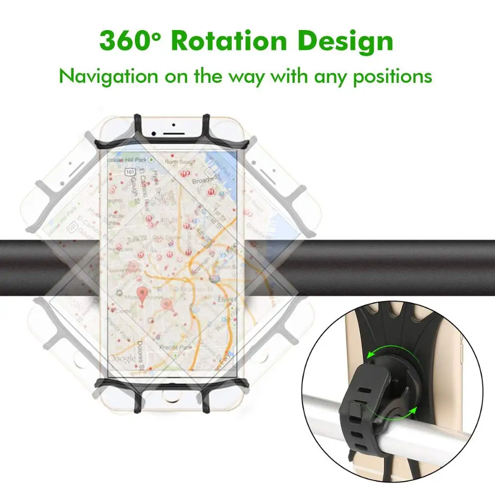 Размер: подходит для мобильного устройства с экраном 4,0-6,0 дюймаЦвет: черныйМатериал: силиконОсобенность: вращение на 360 градусовПрименение: велосипеды, мотоциклы, детская коляскаСовместимость: Универсальная