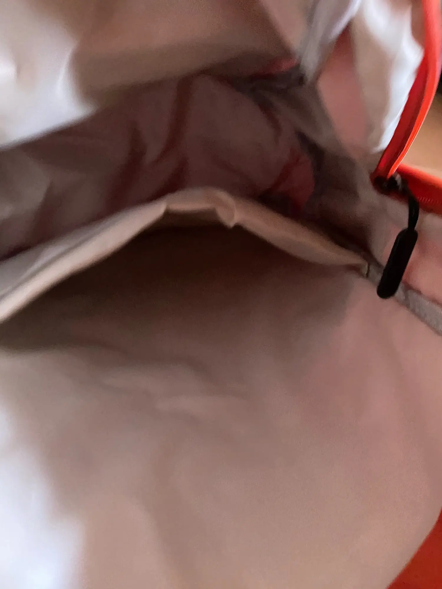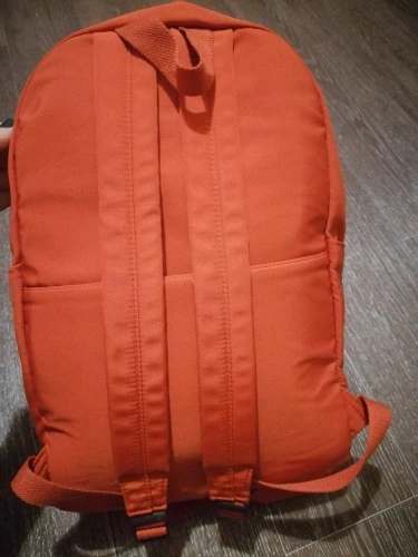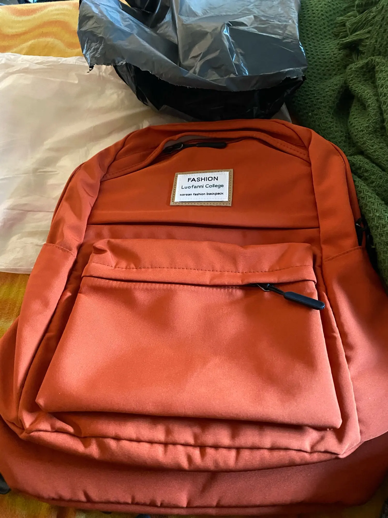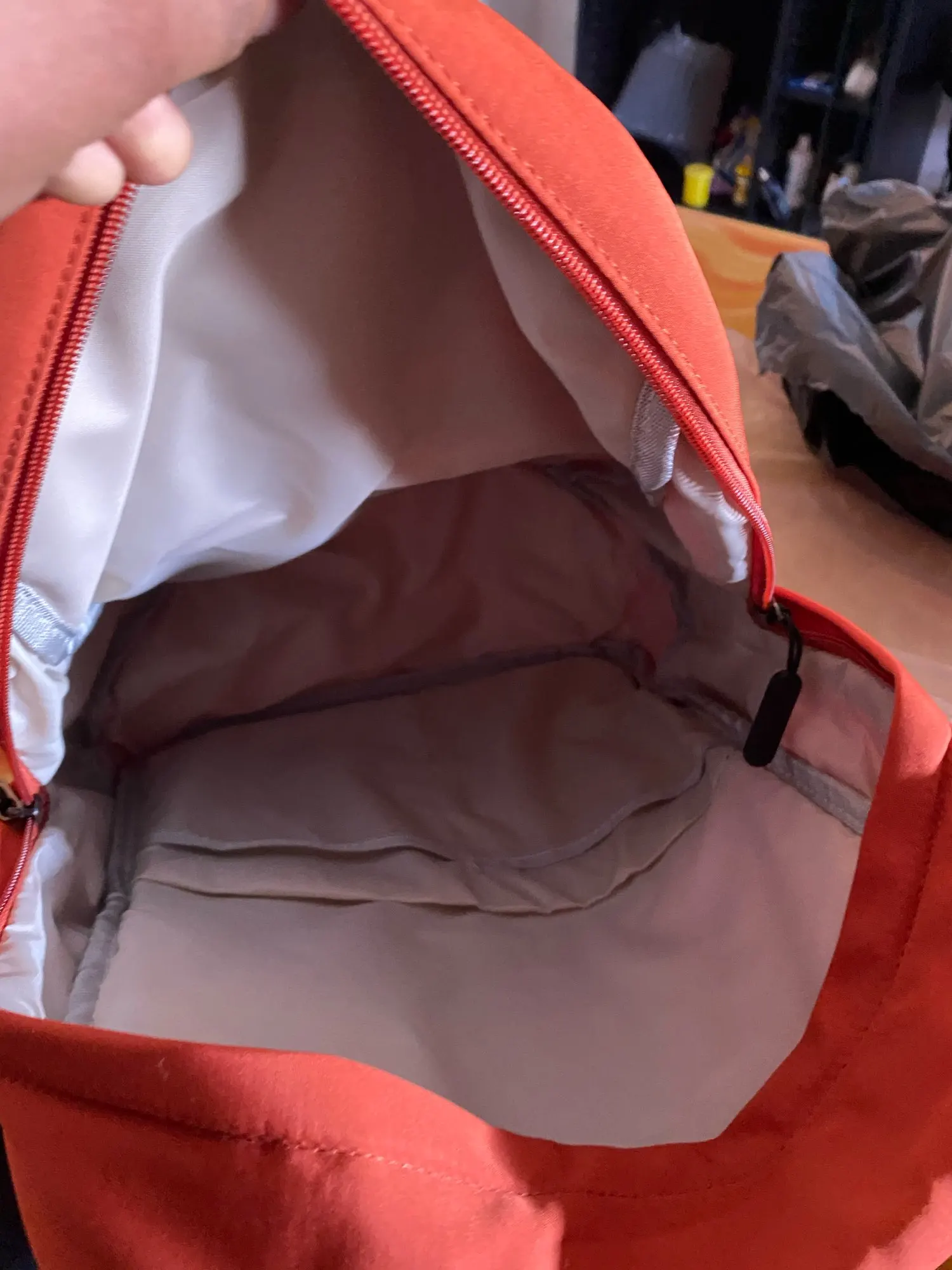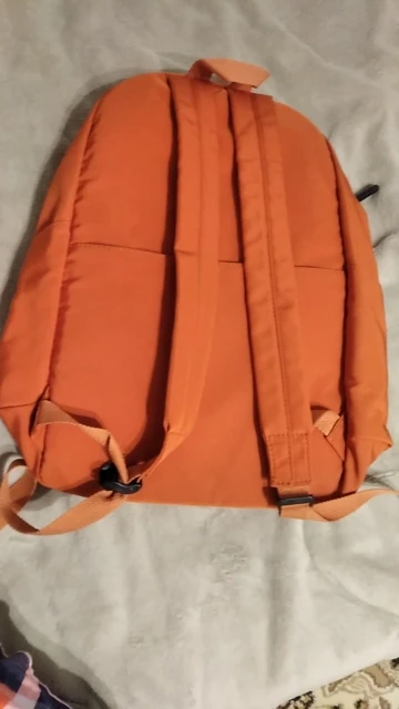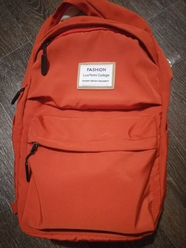 Отличный оранжевый рюкзак! Молнии работают, чистый, без запаха, цвет как на фото.