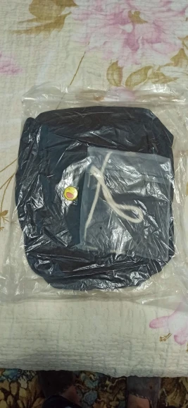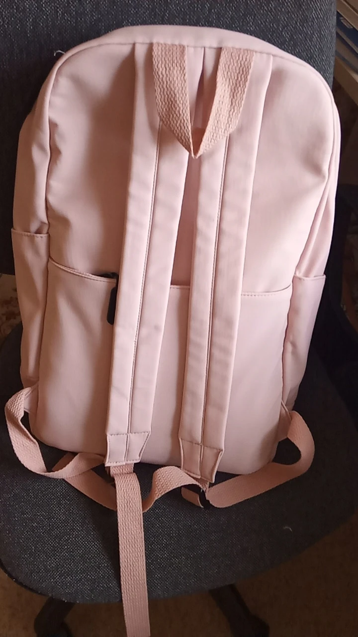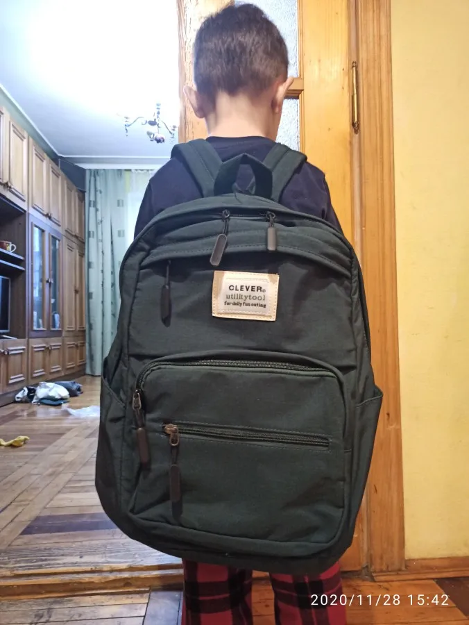 Виглядає як на фото. Сама тканина не дуже товста, багато речей навряд чи витримає. Але загалом якісний, багато відділів. Брала такий, щоб помістився ноутбук. Доставка місяць