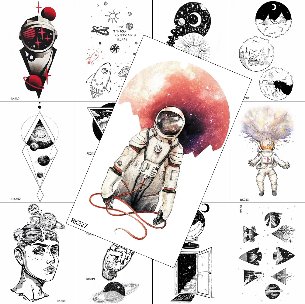 Временная Акварельная наклейка астронавта для татуировок, лист с имитацией тела, переводная наклейка с геометрическим рисунком Галактики для взрослых, Реалистичная татуировка