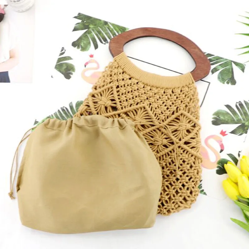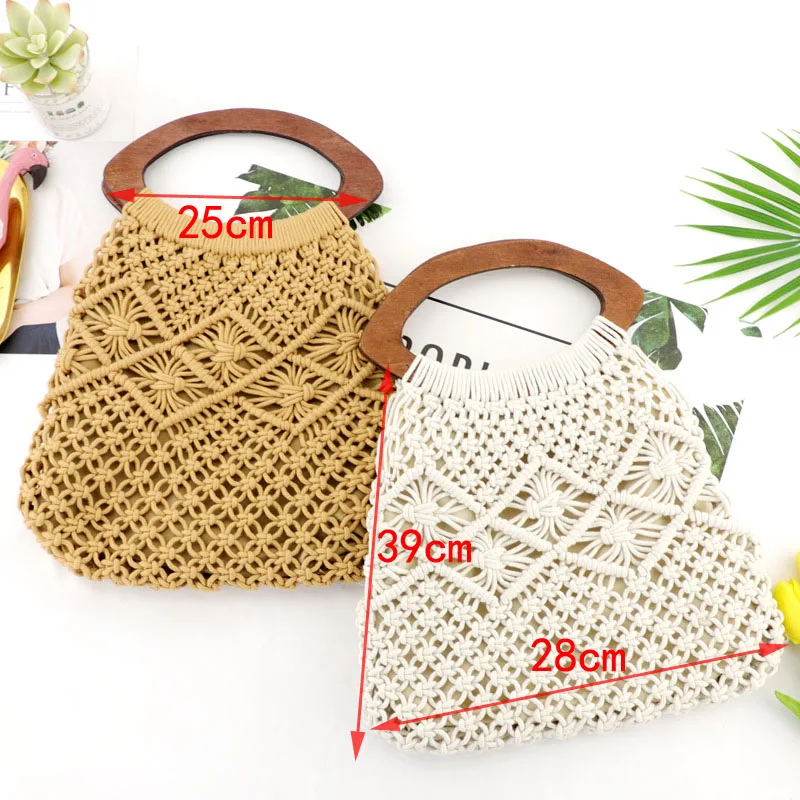 Портативная Плетеная соломенная сумка с деревянной ручкой из хлопкового шнура, Женская пляжная плетеная Сумка