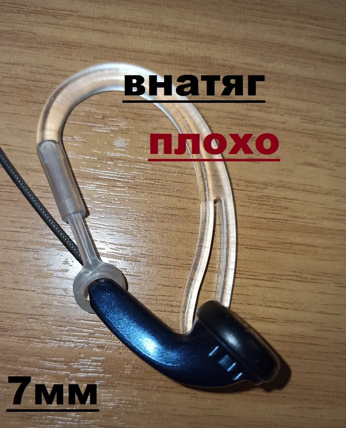 Пришлось дозаказывать. Будьте внимательны: В ЛОТЕ ОПЛАЧИВАЕТЕ ОДИН ПРЕДМЕТ! (одно "ухо") На деле оказались удобными держалками с регулируемым вкладышем (увеличить-уменьшить вылет, повернуть). Пластик -удобный, в меру мягко-пружинистый и не напрягает ухо задним фиксатором. Крепкий и выдерживает вес тела -можете спокойно спать в нём. Из опыта (имхо) применения. Нужен размер отверстия с зазором, в котором ножка наушника "сидит" в свободном, слегка болтающемся состоянии. И тогда крепёж просто поддерживает наушник, который сам принимает нужное положение в ушной раковине. Не понравилось, когда впритык без зазора (синий наушник. Кроме того у него такая форма, что может вообще не подойти крепёж. Или выбирайте самый большой диаметр).