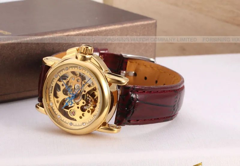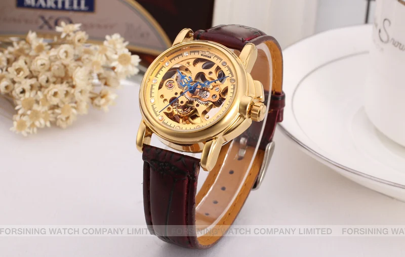 Часы наручные Winner женские Автоматические, брендовые дизайнерские Роскошные с кожаным ремешком и циферблатом, золотистого цвета