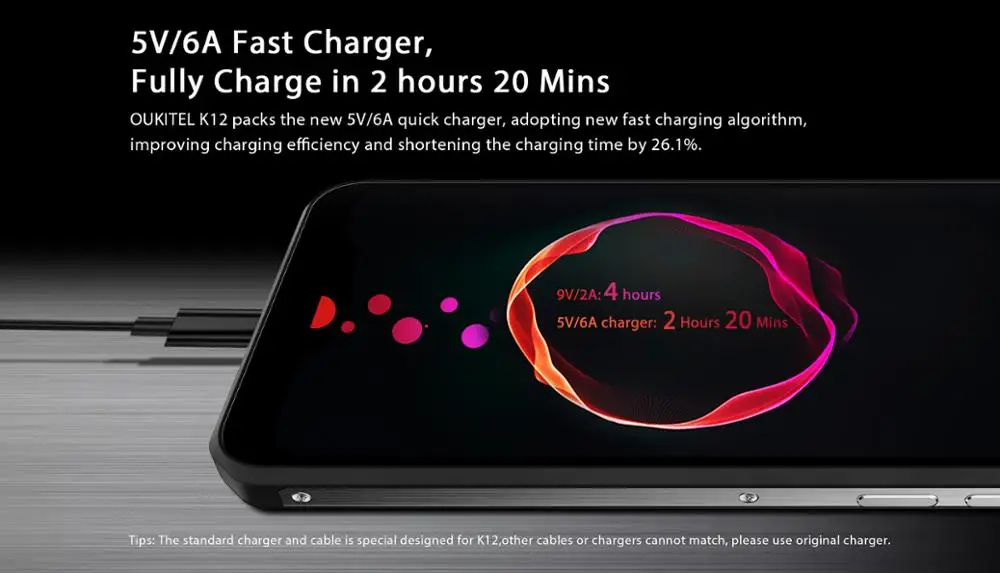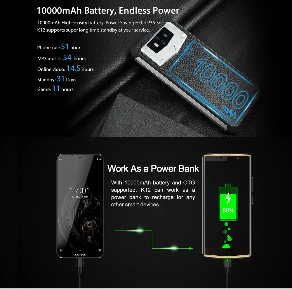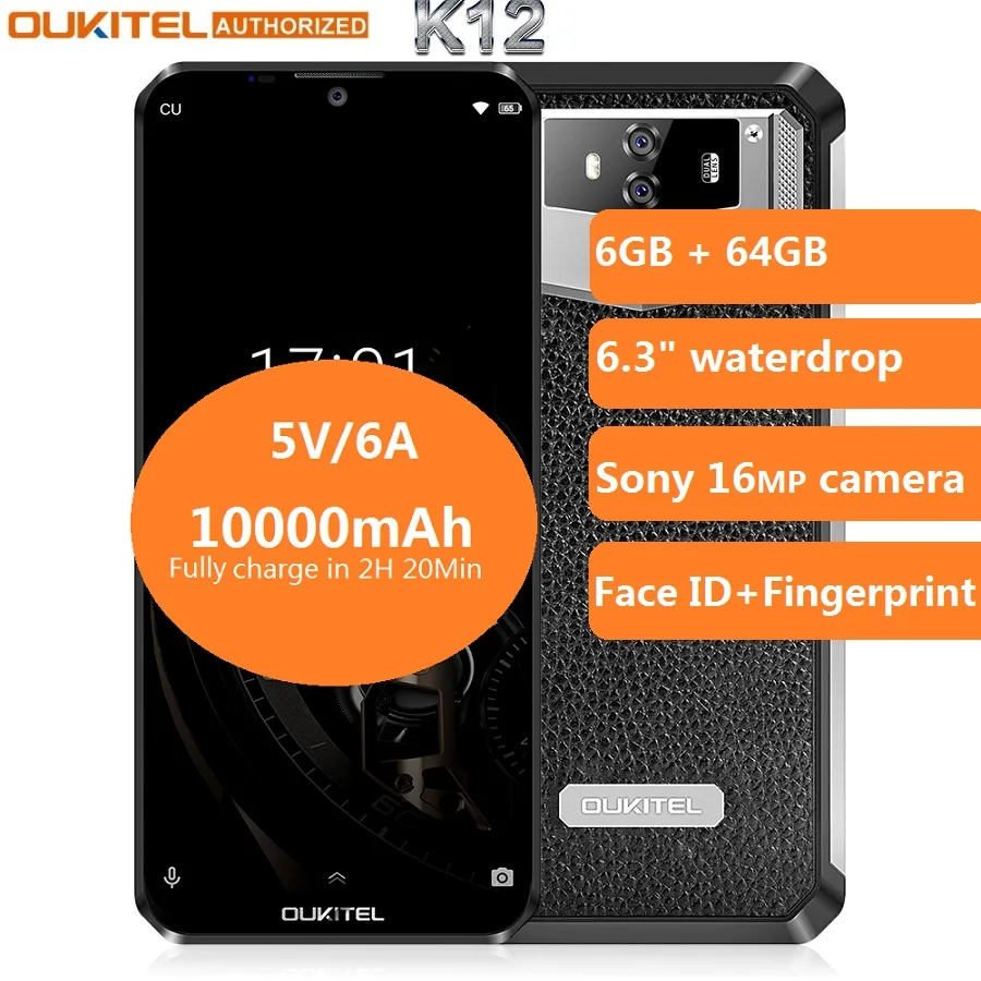 Смартфон OUKITEL K12, 10000 мАч, быстрая зарядка 5 В6 А, FHD + большой экран 6,3 дюйма, Android 9,0, Восьмиядерный, мобильный телефон 6 ГБ 64 ГБ