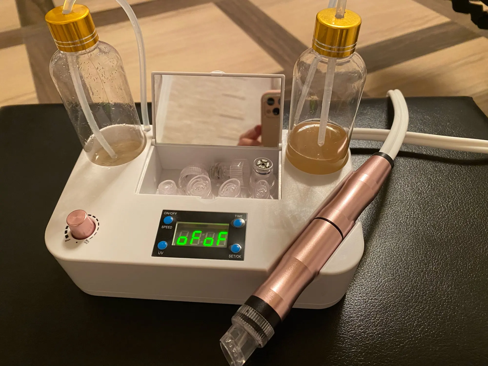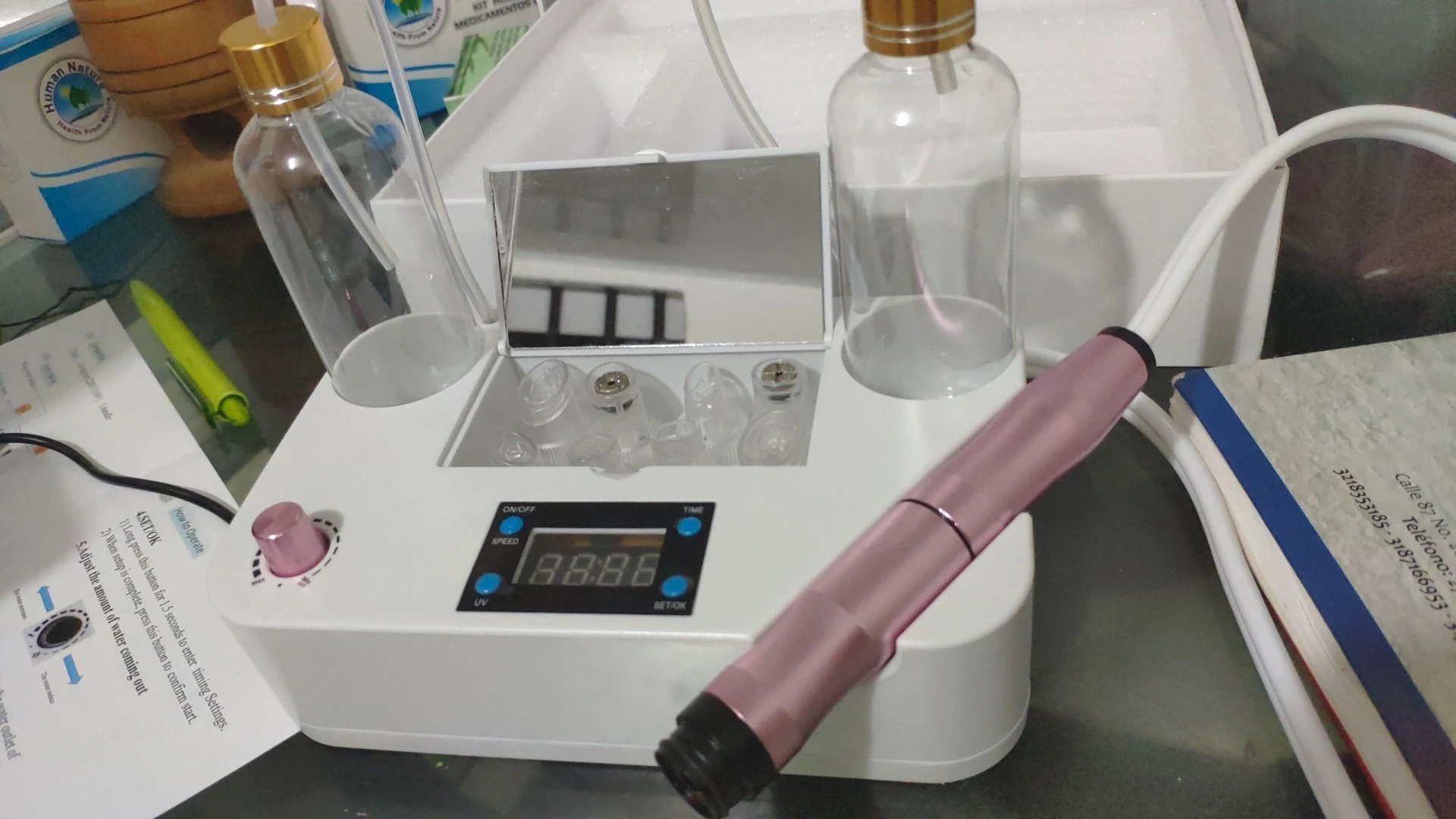 заказала по ошибке, отменить заказ не смогла и написала в support об отмене заказа, но они все равно выслали. стекло пришло разбитое. мощность слабая, вода быстро заканчивается при работе, не успеваешь закончить прозедуру. не рекомендую этот продукт.
