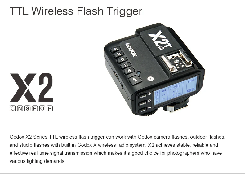 Godox X2 2,4 ГГц TTL Беспроводной с триггером для вспышкиПредназначен для Nikon i-TTL системы и работает на 2,4 ГГц частоты. Беспроводной триггер вспышки может Запускать одну вспышку или несколько выделенных блоков вспышки в пределах 5 групп, 32 канала и 99 настроек идентификатора, чтобы избежать помех от других расположенных рядом систем. Для дополнительного удобства Встроенная функция настройки сканирования может помочь вам автоматически найти ID-канал с наименьшим количеством помех. Вы также можете управлять блоками вспышки в беспроводном диапазоне до 328 '. Все настройки легко просматриваются на большом ЖК-дисплее триггера, который может быть подсвечен вместе с кнопками группы и функции. В Тип USB порт Type-C находится на боковой стороне с беспроводным триггером для загрузки обновления прошивки as-это 3,5 мм синтетическая розетка для подключения non-TTL вспышек или к пожару камеры с помощью дистанционного кабель для камеры. Загружаемое приложение GodoxPhoto совместимо со смартфонами или планшетами iPhone или Android во время работы триггеров через Bluetooth. Приложение может управлять такими же функциями, как беспроводной триггер, как режим вспышки, выходная мощность, моделирующий светильник, Высокоскоростная синхронизация и звуковой сигнал вспышек Godox.