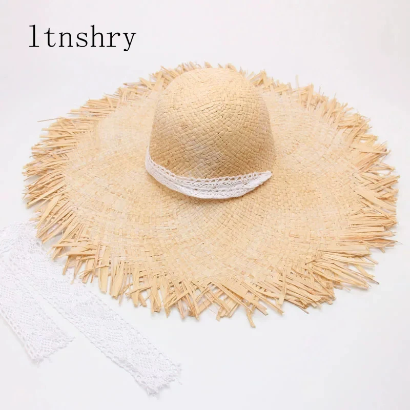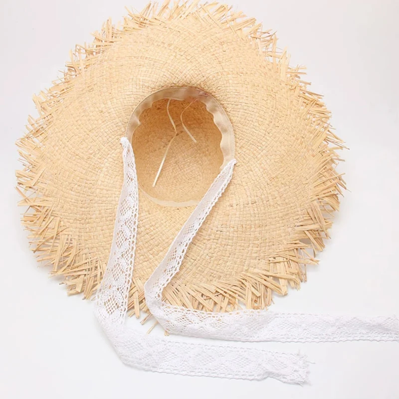 2019 Женская плетеная шляпа из рафии, летняя Солнцезащитная шляпа с лентой, пляжная шляпа с широкими полями, белые соломенные шляпы на шнуровке для отдыха на открытом воздухе