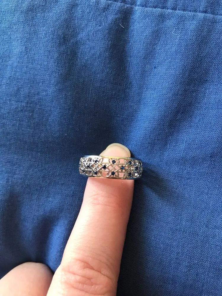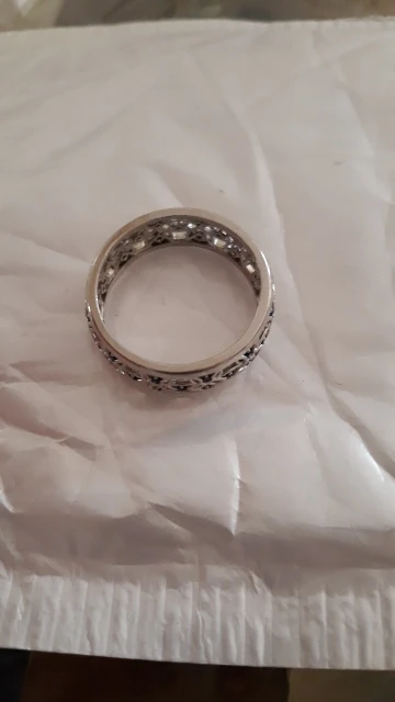 Прибыл через 2 недели в пузырчатом конверте. Нет штампа 925, но это красивое кольцо. Металл меньше блестит, чем на картинке. Выглядит как нержавеющая сталь. Моей маме это понравилось, и ей это нравится. Мы увидим, как долго это длится.