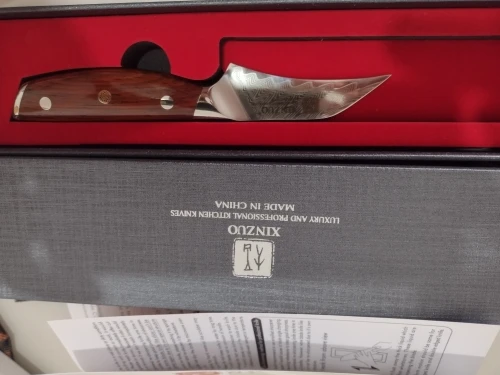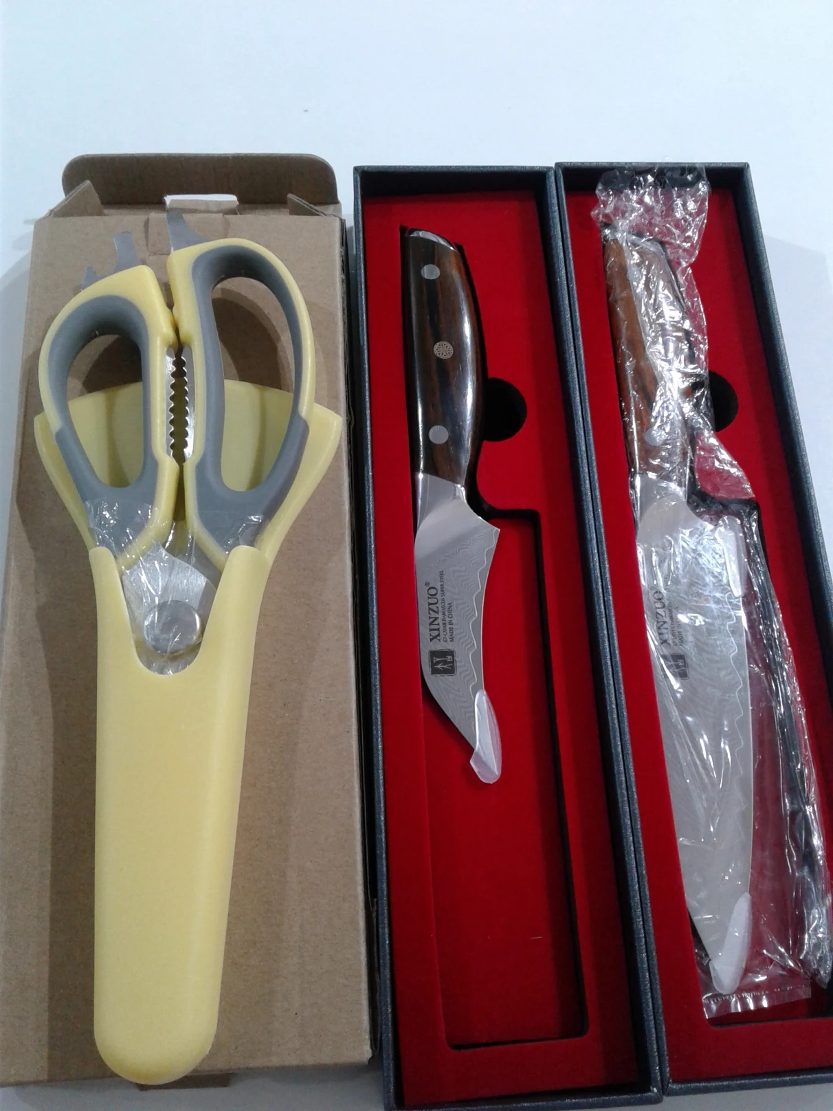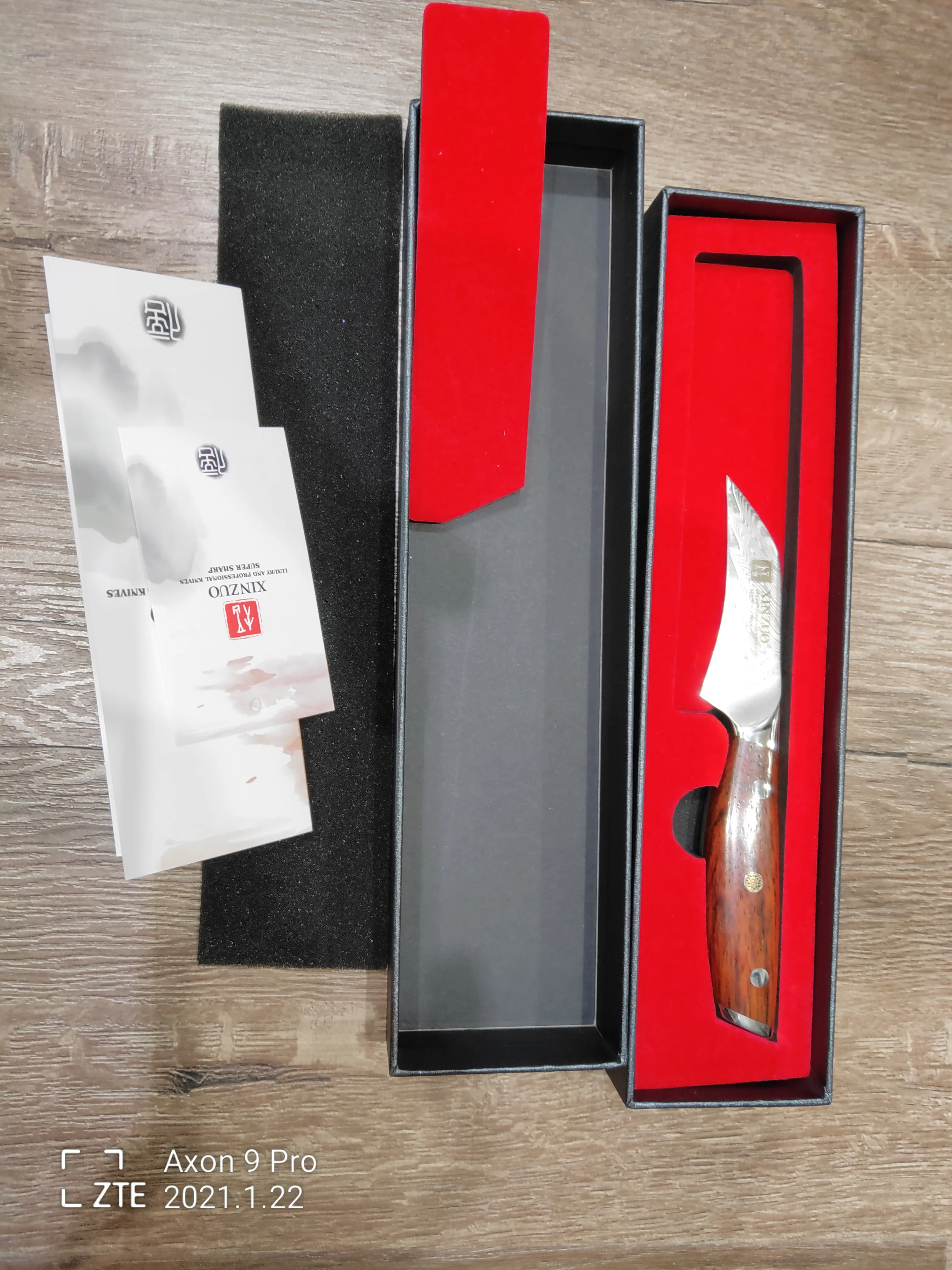 Я заказала 4 ножа разных размеров. Продавец разделил 4 ножа на 2 трека на 2 посылки. Пришлось поволноваться, так как посылки пришли с разницей в неделю. Продавец отвечал на мои сообщения вежливо, просил набраться терпения. Продавцу отдельное уважение. Ножи были упакованы в пупырку надежно. Каждый нож в отдельной подарочной упаковке с сертификатами качества и паспортами. Дамасская сталь это или нет, мне трудо судить. Ножи по весу тяжелее ожидаемого на взгляд. Деревянные ручки, клеймо бренда впечатляют. Волнистые линии на ножнах - это принт. Хотя когда я заказ оформляла по фото у Продавца, думала, что волнистые линии это 67 слоев дамасской стали :). Видимо ошибалась. Размер рукояток великоват для средней женской руки. Продавец сделал хорошую скидку на время черной пятницы. И положил в качестве подарка продуктовые ножницы с монтажной лентой для крепления на стену. Было очень-очень приятно. Я очень рекомендую этот фирменный магазин и Продавца.