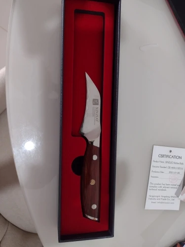 Отличный дизайн для кухонного ножа. Прекрасная работа, острый и надежный нож. Правильная упаковка. Быстрая доставка и в срок.