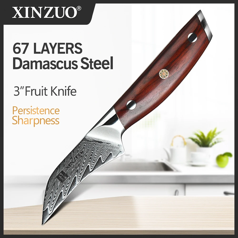 Кухонный нож XINZUO, эргономичная Мозаика из дамасской стали, 3 дюйма, ручка из розового дерева, для чистки фруктов