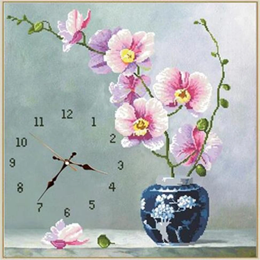 Ваза с искусственной орхидеей часы с узором, 5D алмазная Вышивка Полный макет Алмазная картина Стразы (без часовых часов) WG547