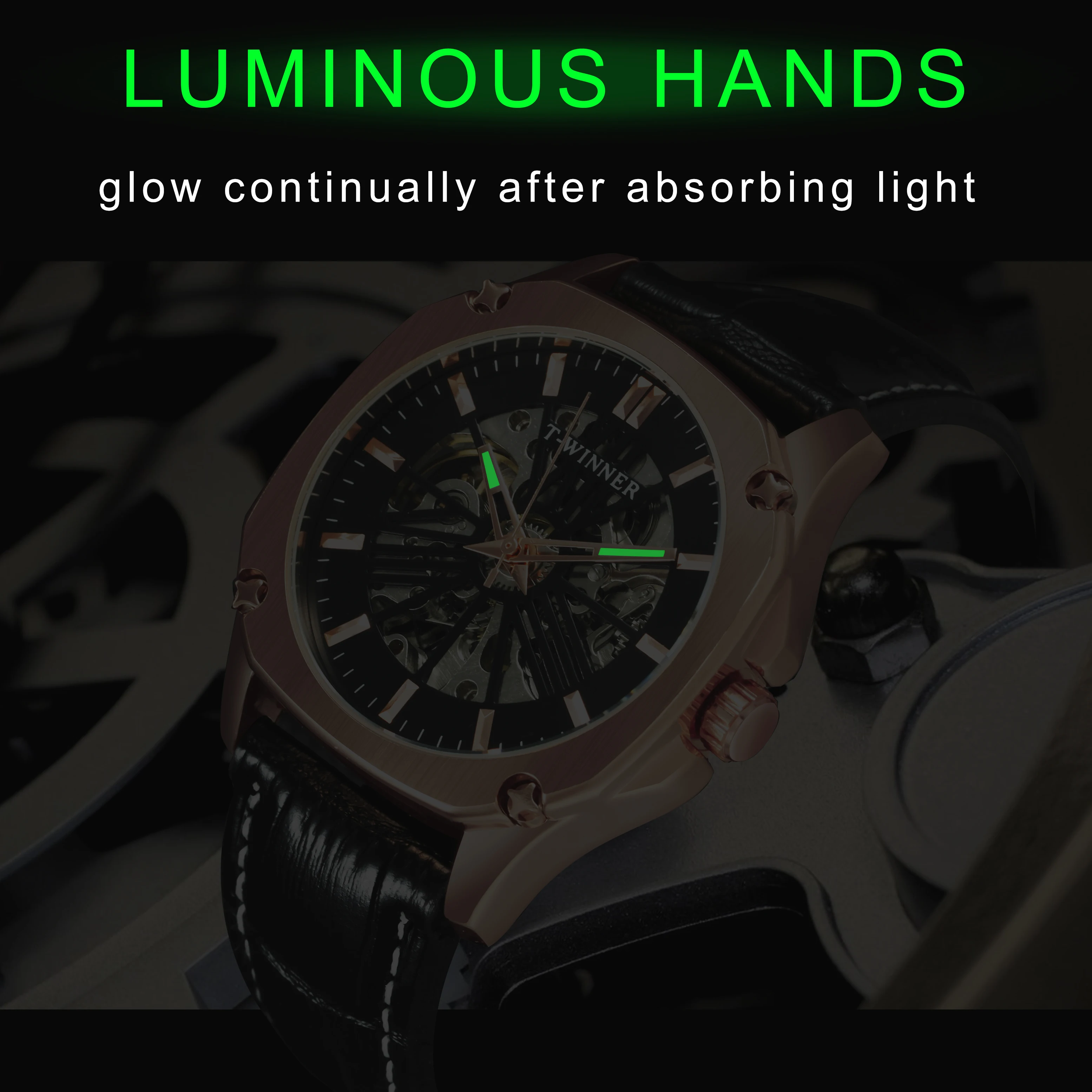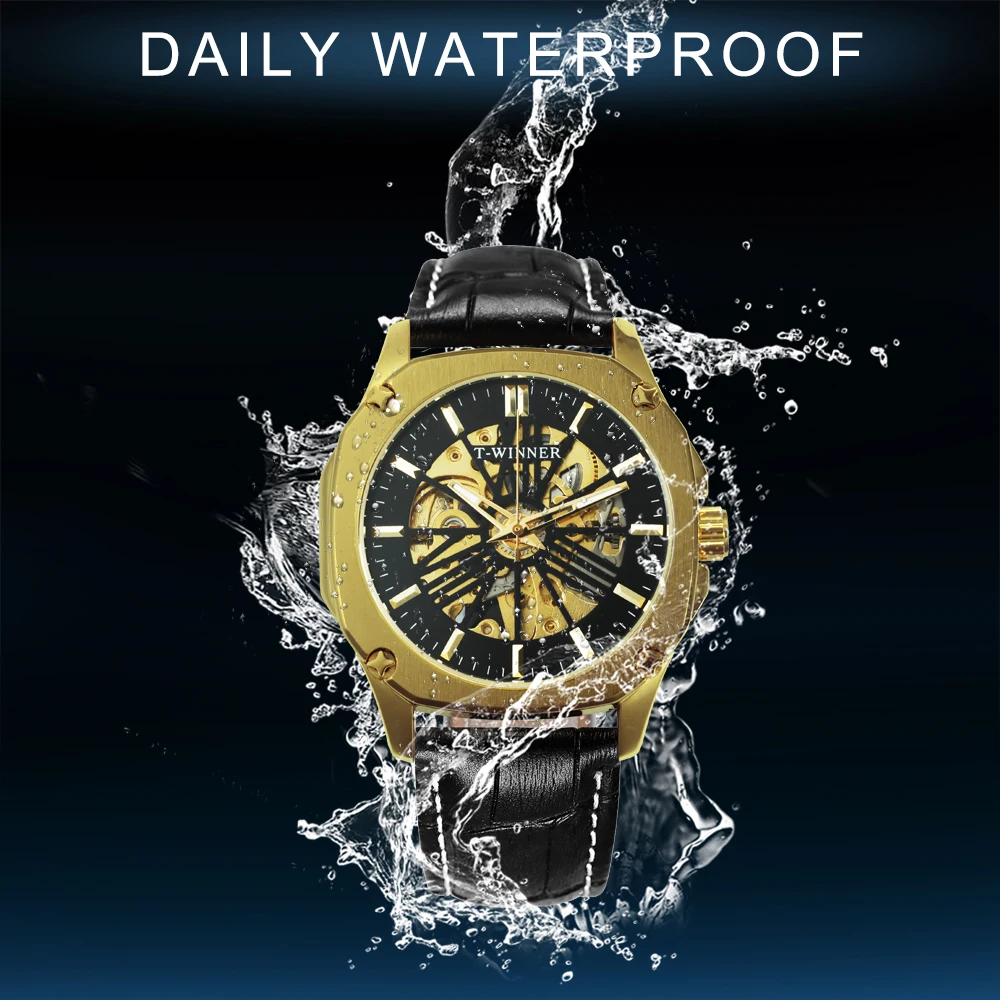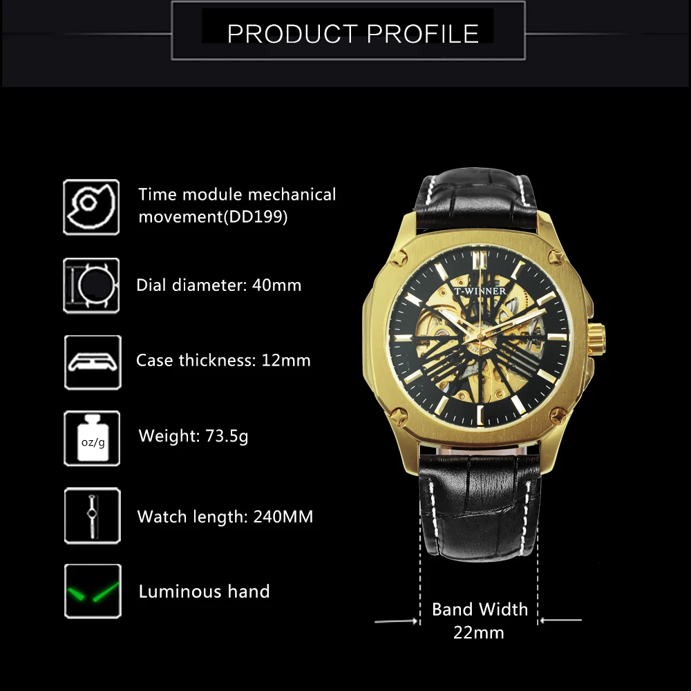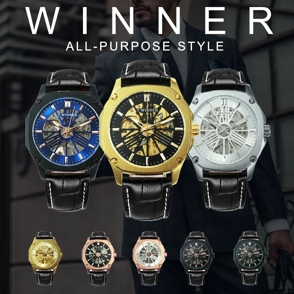 T-WINNER новые мужские часыБренд: WINNER( T-WINNER)ПРИМЕЧАНИЕ. Официальный магазин завода Winner, 100% оригинальные подлинные часы, продажа оптом и в розницу.Стиль: Модный, Повседневный, деловой, роскошный, спортивныйОсновная особенность:1. Часы с креативным дизайном, в стиле хип-хоп2. Новые модные часы с кожаным ремешком.3. 12-месячная гарантия на движениеПодходящий Случай:Идеально подходит для любых случаев и мероприятий вечерние, юбилеев, деловых встреч, повседневных занятий спортом на открытом воздухе, занятий в помещении или повседневного использованияХарактеристики:Диаметр циферблата: 40 ммТолщина чехла: 12 ммДлина Часов: 240 ммШирина ремешка: 22 ммВес часов: 73,5 гМеханизм: автоматический самообдувМеханический (батарея не требуется)Материал зеркала: HardlexТип застежки: ПряжкаБлестящая фурнитураВодостойкость: водонепроницаемые для ежедневного ношения (не для купания или душа)Посылка входит:1 x часы (подарочные коробки опционально)