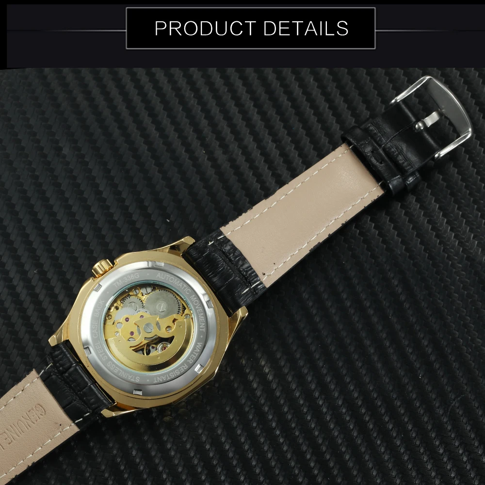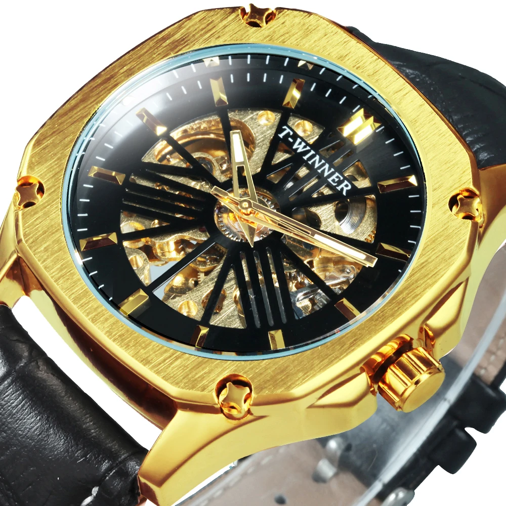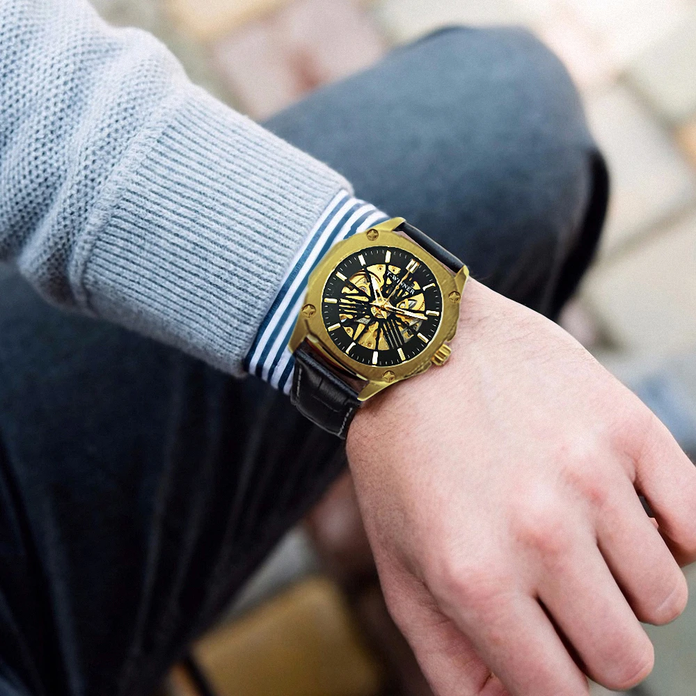 Часы наручные WINNER Мужские механические, автоматические Роскошные брендовые дизайнерские чёрные с кожаным ремешком, золотистые