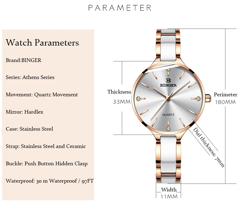Женские кварцевые часы BINGER из натуральной швейцарской стали, с к...