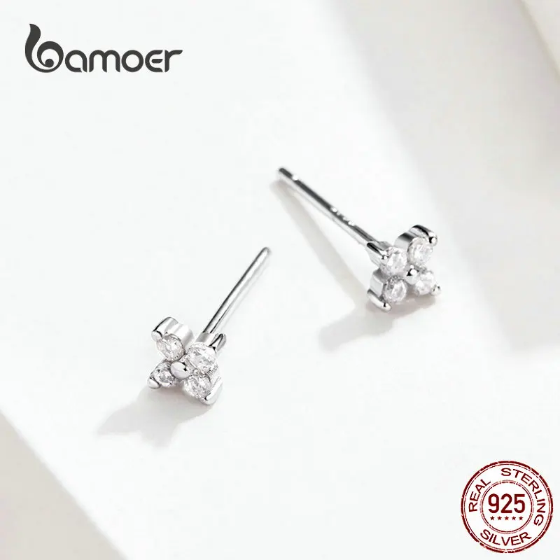 Маленькие серьги-гвоздики bamoer для девушек из серебра 925 пробы с прозрачным кубическим цветком, легкие серьги для офиса, ювелирное изделие SCE648