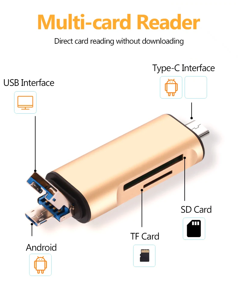 Заказ оплачен 28.09, отправлен 29.09. во Владивосток прибыл 22.10 (вот такая у нас почта - из Китая на ДВ через Москву). Кард-ридер пришел в целости, работает везде, кроме одного десктопа - не удается нормально вставить в USB разъем. Ничего сверхестественного, ну да это все лишь кард-ридер. Ну и варианта USB/microUSB здесь нет, это видно на картинке, т.ч. для этого сочетания придется купить что-то отдельно.
