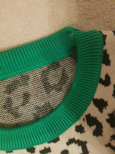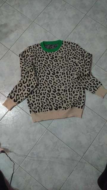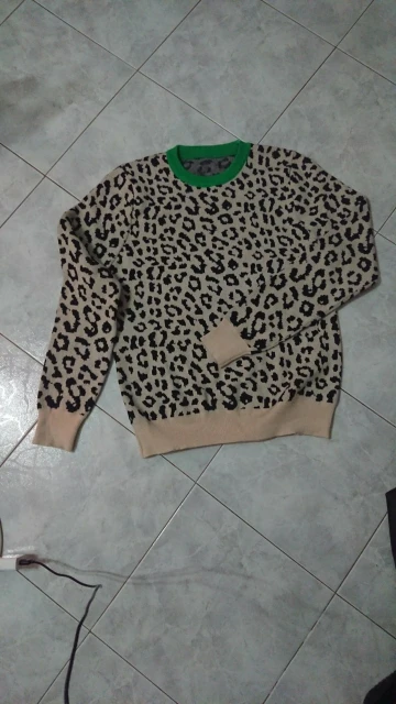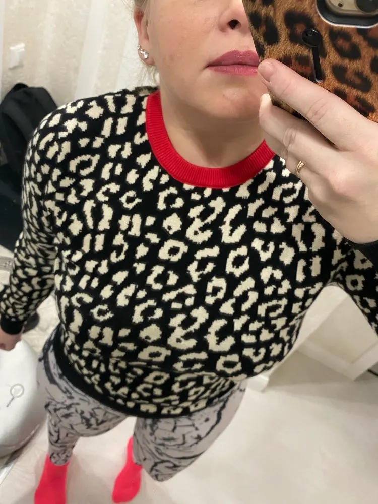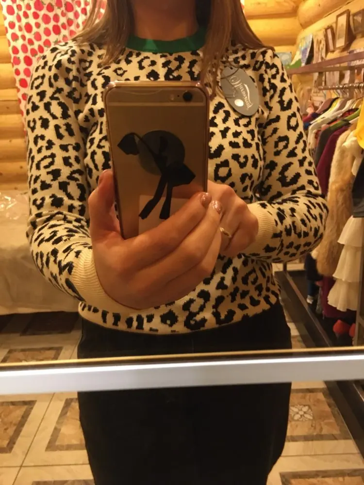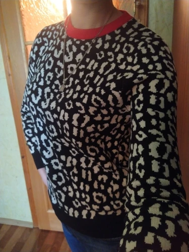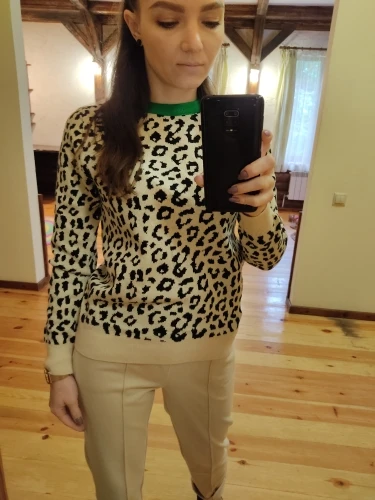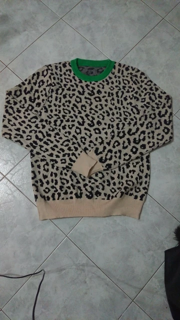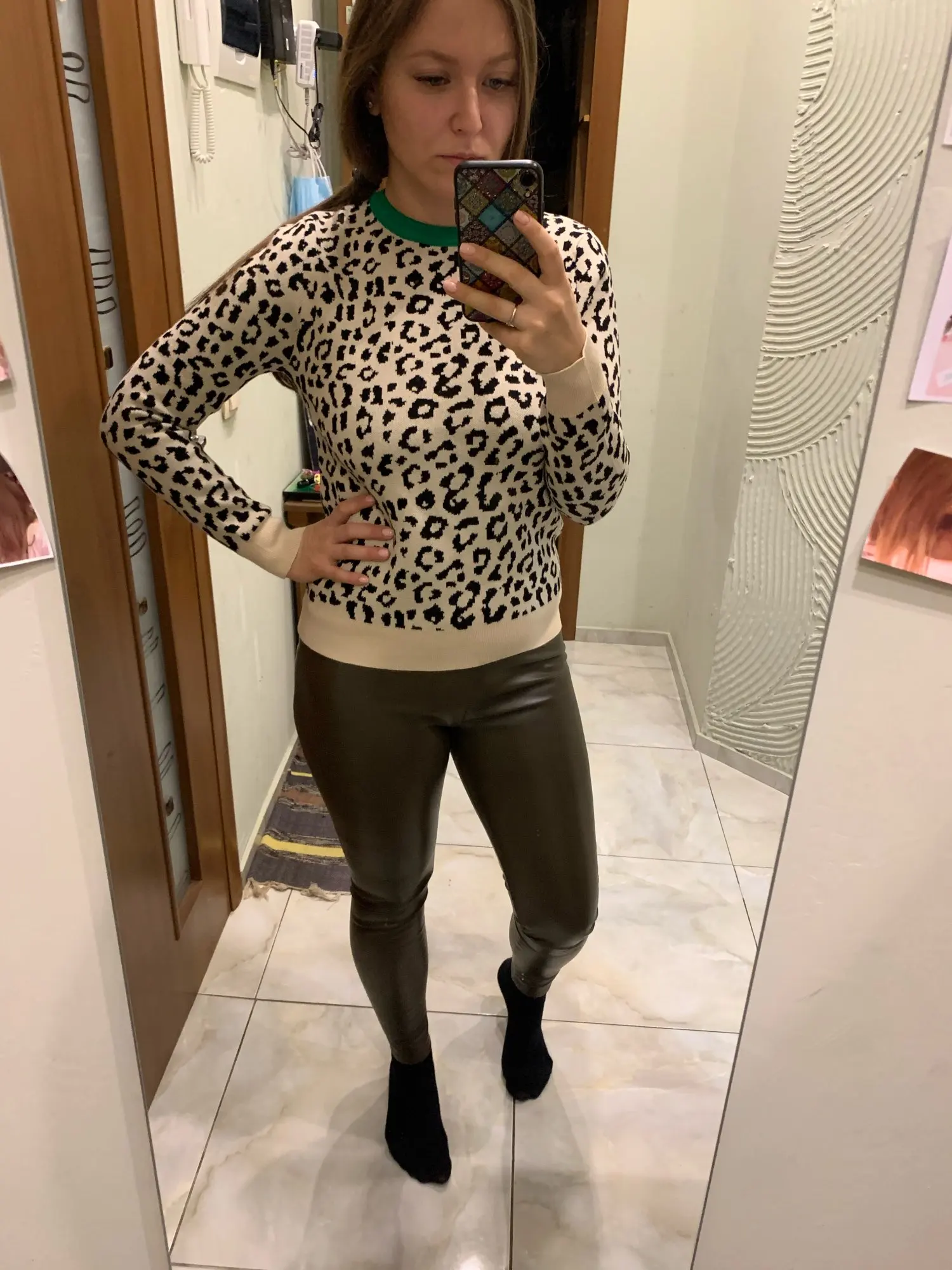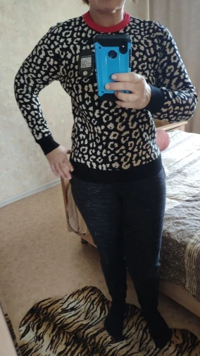 Свитер очень клёвый - качество материала просто огонь - гладкий, сияет. Хочется гладить и гладит. Зелёный воротник очень освежает леопардовый принт и даёт новые возможности для сочетания с другими вещами в гардеробе. На ОГ 78 ОТ 65 ОБ 87 и рост 165 S подошёл в самый раз. По длине рукава - отворот делаю, так что запас на рост до 175 точно. Длина отличная - до середины бедра: можно на выпуск носить, или заправить без большого комка изнутри. Швы ровные, зацепок по ткани нет. Однозначно оставлю! Рекомендую продавца - качество на высоте, отправка быстрая - 10 дней в Краснодар, упаковка - все целое!