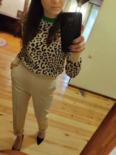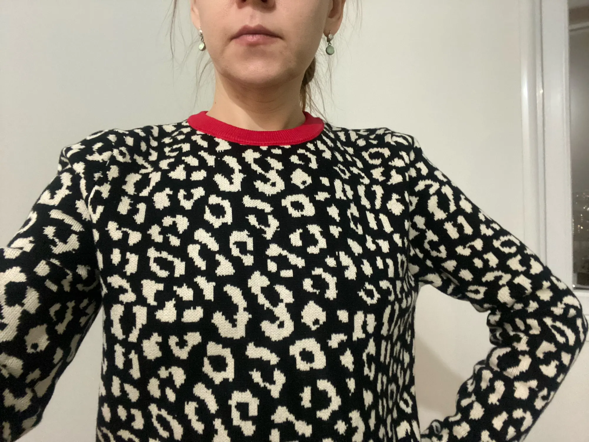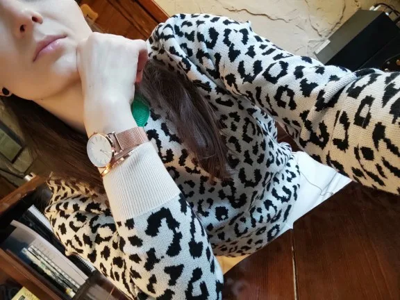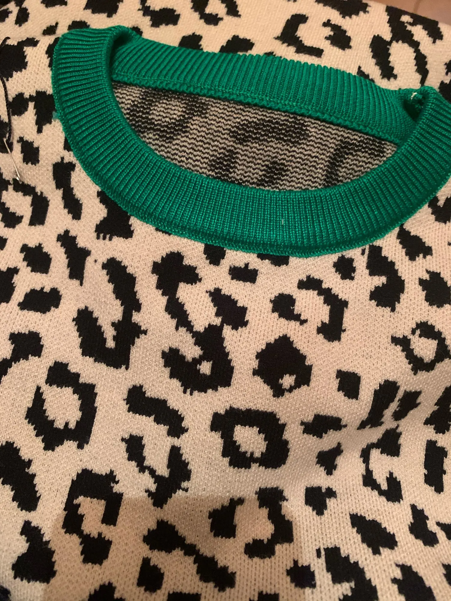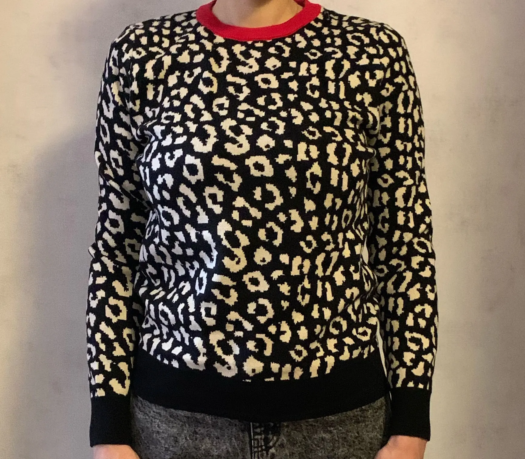 Свитер очень клёвый - качество материала просто огонь - гладкий, сияет. Хочется гладить и гладит. Зелёный воротник очень освежает леопардовый принт и даёт новые возможности для сочетания с другими вещами в гардеробе. На ОГ 78 ОТ 65 ОБ 87 и рост 165 S подошёл в самый раз. По длине рукава - отворот делаю, так что запас на рост до 175 точно. Длина отличная - до середины бедра: можно на выпуск носить, или заправить без большого комка изнутри. Швы ровные, зацепок по ткани нет. Однозначно оставлю! Рекомендую продавца - качество на высоте, отправка быстрая - 10 дней в Краснодар, упаковка - все целое!