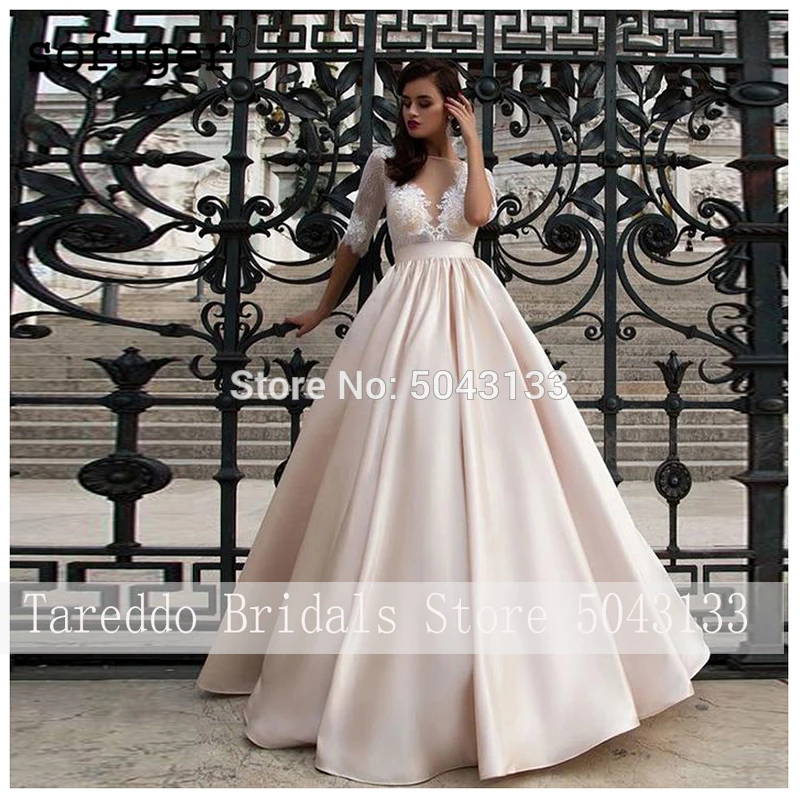 Атласное свадебное платье с глубоким V-образным вырезом, карманом и кружевом