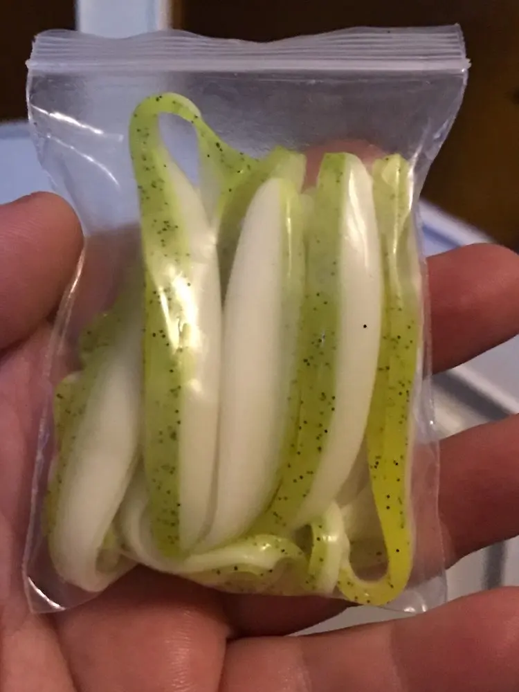 отличный товар. не сильно пахнет, крепкие и хорошего цвета, у всех резинок блёстки. уверен, что уловистые. советую. пришли оч быстро.