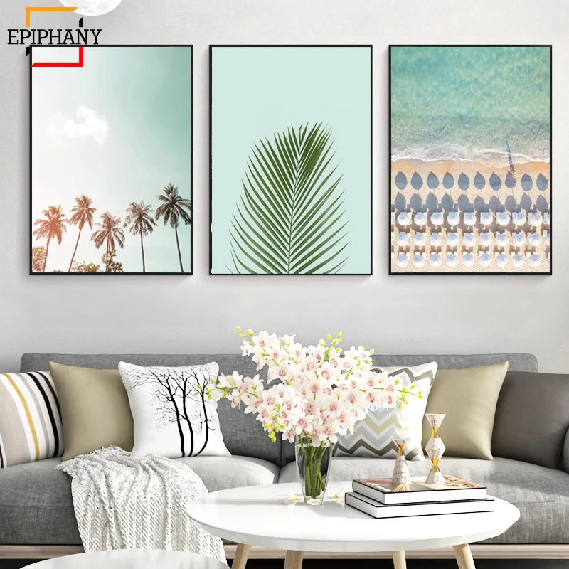 Современные настенные художественные декорации, Пляжный Пейзаж, холст, живопись, пальмовые плакаты с листьями и принтами, бохо-Арт Принт, картинки для гостиной