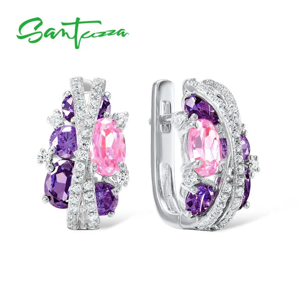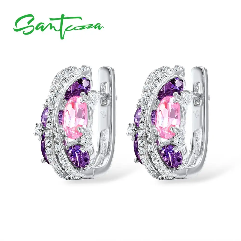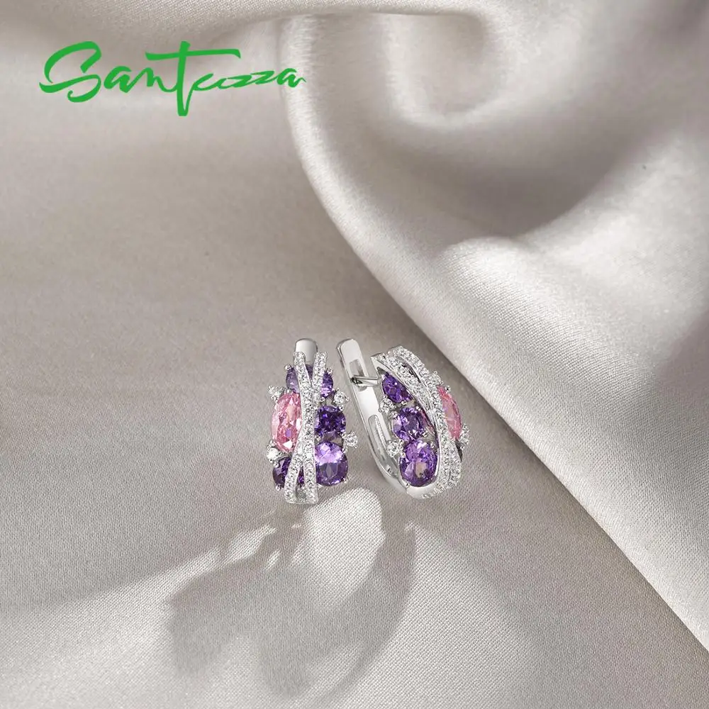 Кольцо и серьги SANTUZZA, из серебра 925 пробы, со сверкающим фиолетовым аметистом, розовым кубическим цирконием, набор украшений для женщин пробы, Роскошные ювелирные украшения