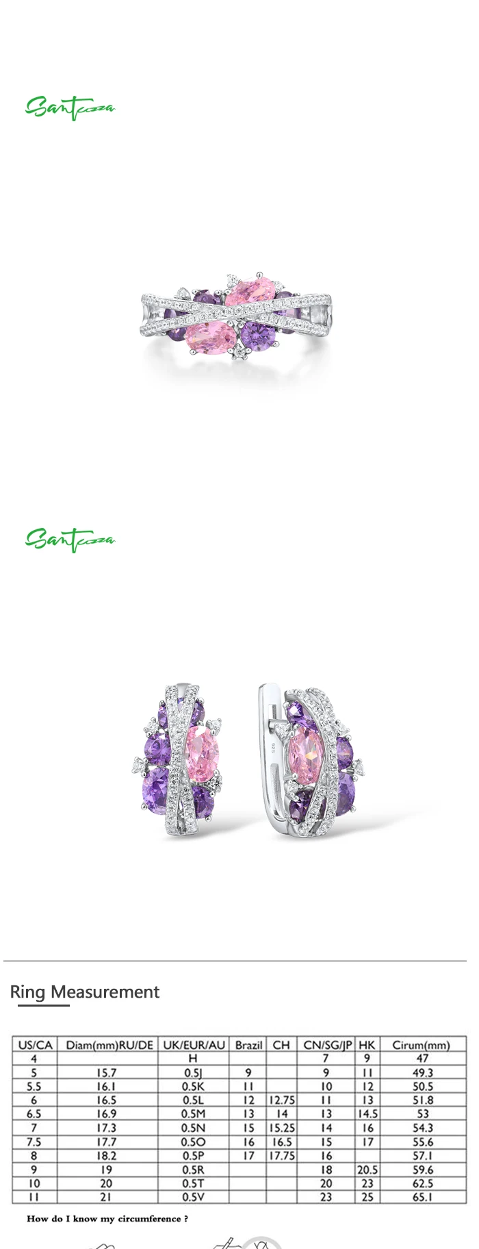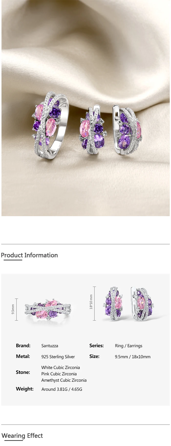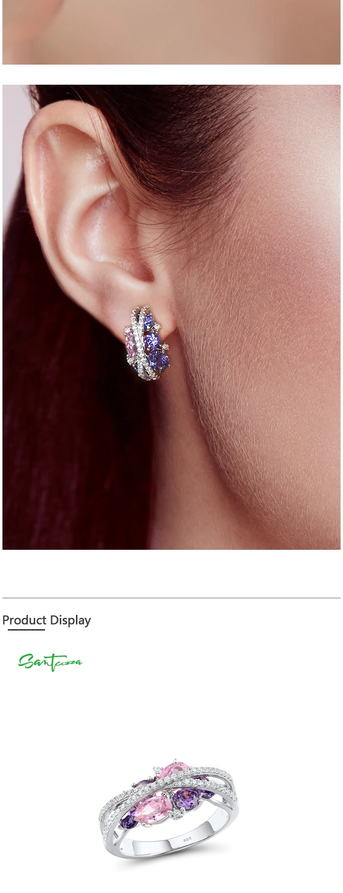Кольцо и серьги SANTUZZA, из серебра 925 пробы, со сверкающим фиолетовым аметистом, розовым кубическим цирконием, набор украшений для женщин пробы, Роскошные ювелирные украшения