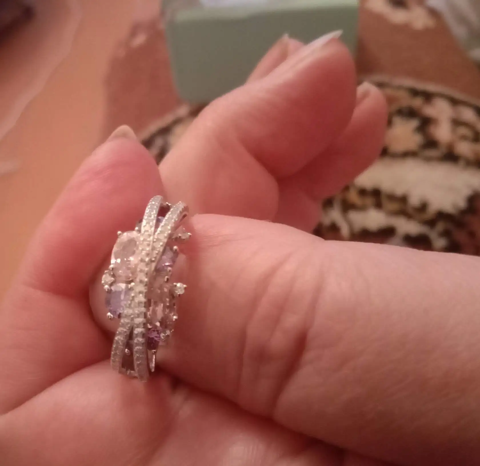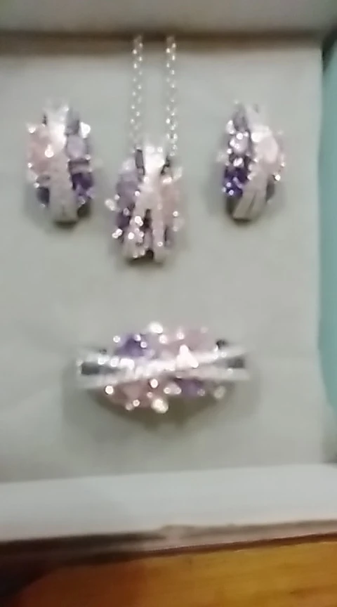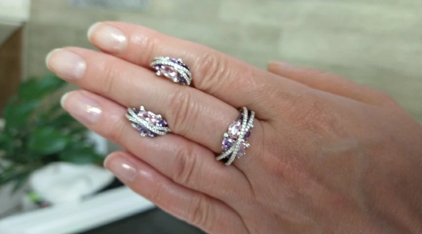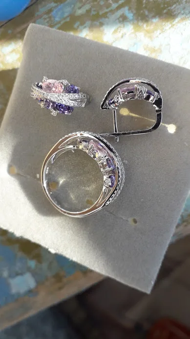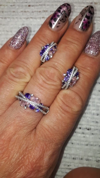 Заказ пришёл в МО за 2 недели. Спасибо за скорость! Долго лежал этот набор в корзине, сомневалась. Но вот на июньскую распродажу решилась. Какой же он красивый! Блеск при лампе и дневном свете изумительный. На свой российский 17 размер взяла 6,5, потому что 7 из другого набора болтается. Кольцо село очень хорошо.