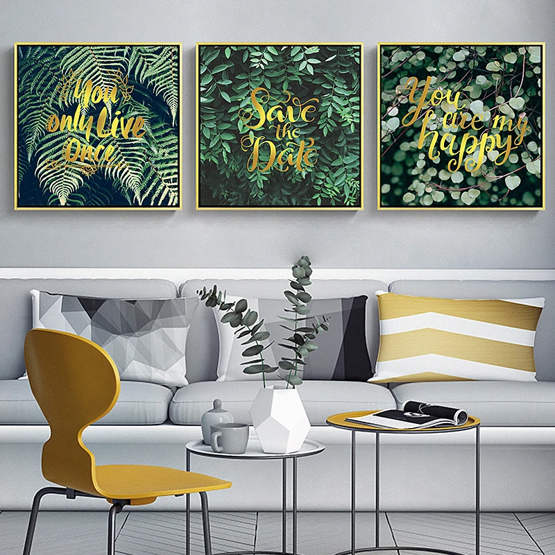 Скандинавский минималистичный абстрактный желтый текст Холст Картина зеленые листья растения Печать букв плакат лист Настенная картина украшение дома