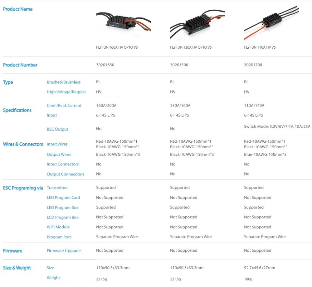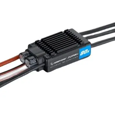 80A V5:Ток: 80А (пиковый ток: 100АРазмер: 69.8x34.6x19Аккумулятор: 3-6S LipoВес: 92 гSwithch BEC 5,2 V/6V/7,4 V на опцииВыходной ток: 8А (пиковый ток 20А)Программируемая карта: светодиодный цифровой или пульт дистанционного управления для программирования