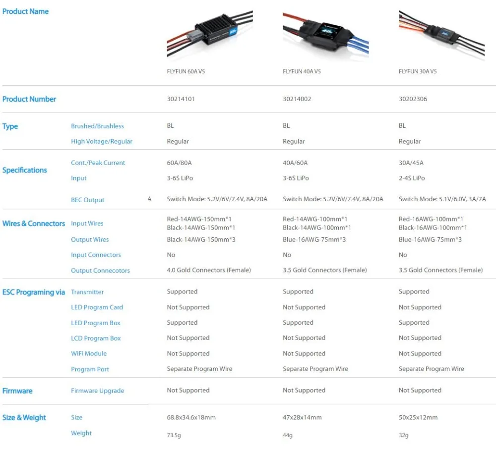 60A V5:Ток: 60A (пиковый ток: 80A)Размер: 68.8x34.6x18ммАккумулятор: 3-6S LipoВес: 73,5 гSwithch BEC 5,2 V/6V/7,4 V на опцииВыходной ток: 8А (пиковый ток 20А)Программируемая карта: светодиодный цифровой или пульт дистанционного управления для программирования