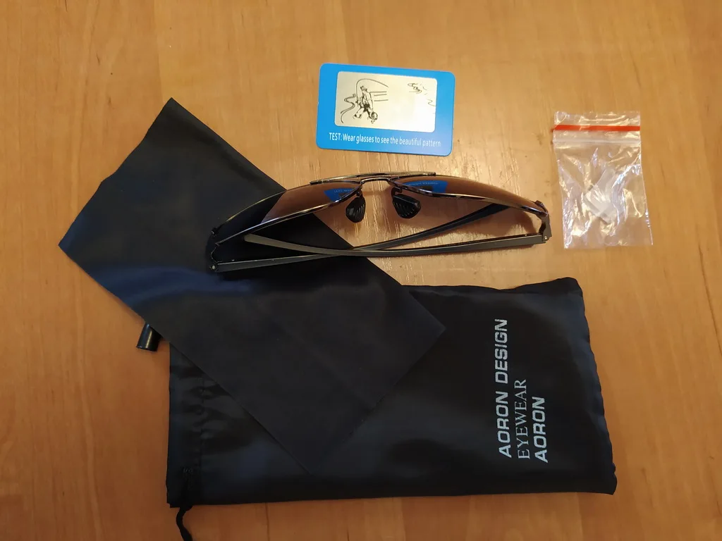 Отличные очки! В комплекте чегол, тряпочка для протирки, зачем-то заглушки на концы дужек *зачем?) и тестовая картинка на поляризацию - работает. Однако, я рассчитывал, что очки будут более тёмными.