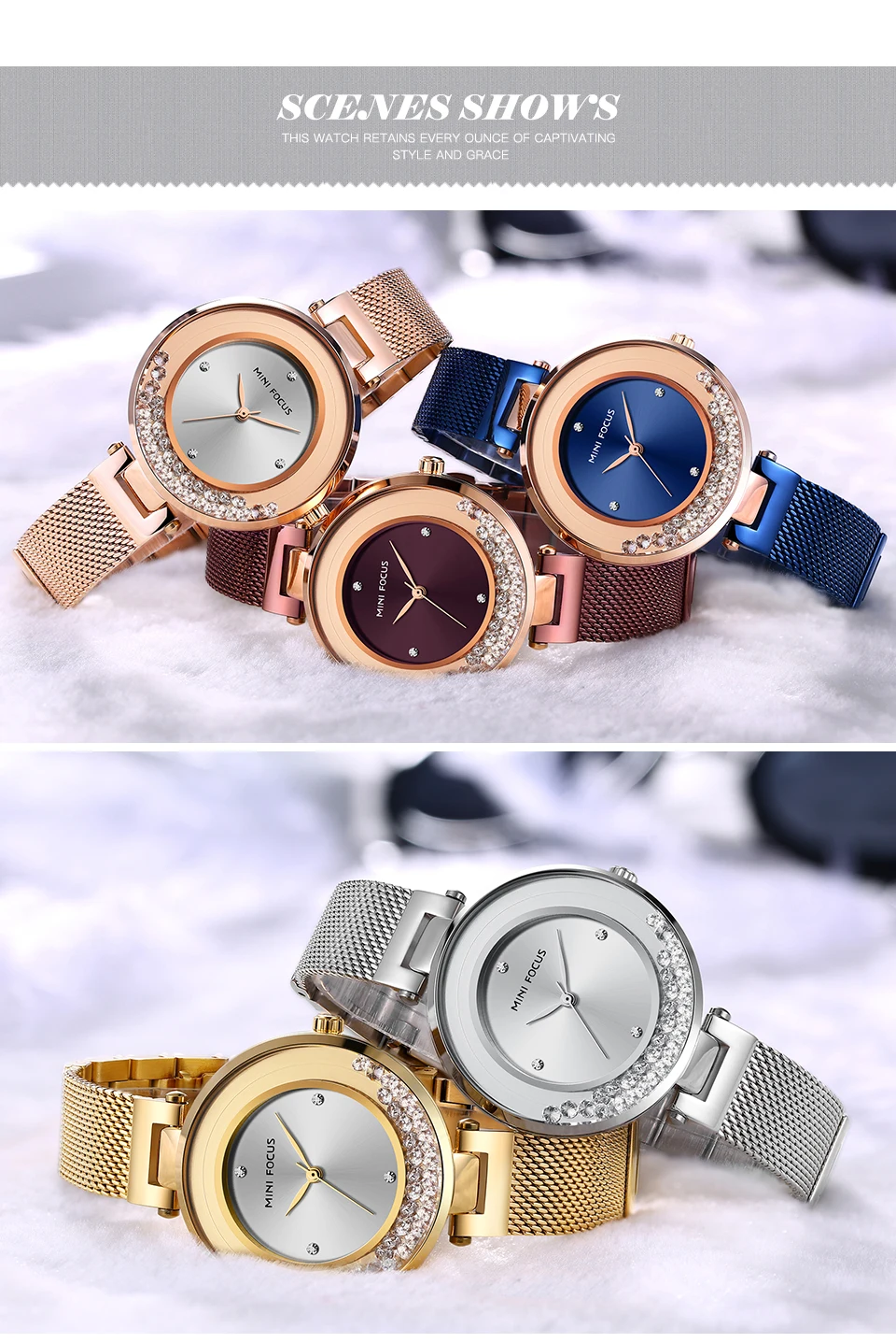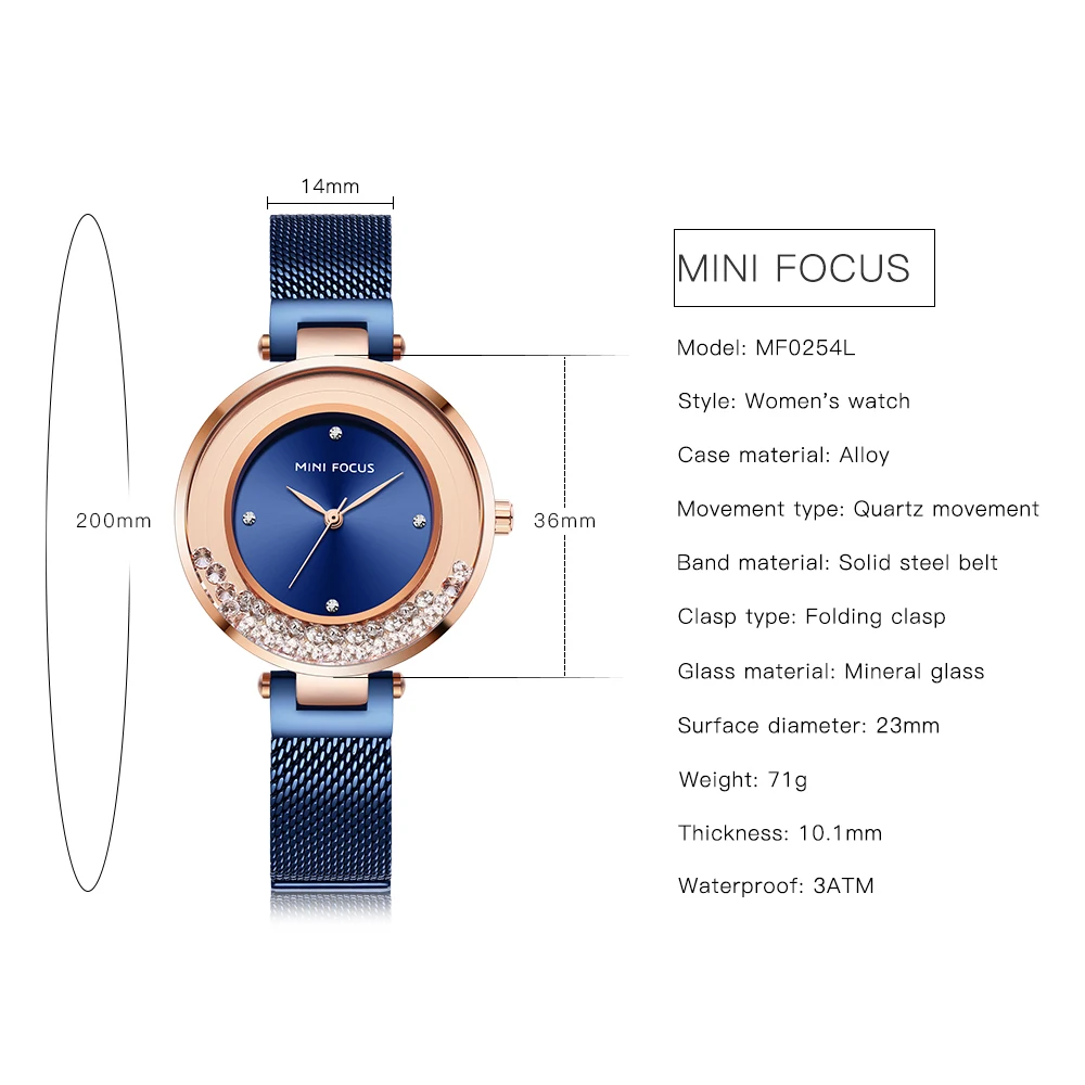 Модные женские часы MINI FOCUSБренд: MINI FOCUS(MINIFOCUS)Стиль: Модный, Повседневный, деловой, роскошный, спортивныйОсновная особенность:1. Часы классического дизайна, модный стиль платья2. Новые модные часы с сетчатым ремешком.3. Гарантия на 12 месяцевХарактеристики:Диаметр циферблата: 36 ммЧехол Толщина: 10,1 ммДлина Часов: 200 ммШирина ремешка: 14 мм Вес часов: 71 гМеханизм: кварцевый (требуется батарея)Материал зеркала: HardlexТип застежки: складная застежка с безопаснойВодонепроницаемость: Водонепроницаемость (не для плавания или душа)Подходящий Случай:Идеально подходит для всех случаев и мероприятий: вечерние, юбилейные, деловые, повседневные, спортивные, домашние или повседневныеПосылка включает в себя:Часы-1 шт. (подарочные коробки на выбор)