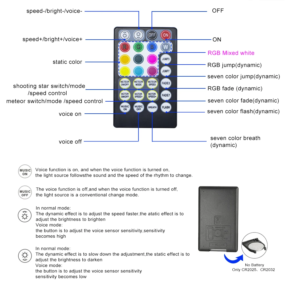 Светильник: цвет Stati (смешанный белый, чистый, белый, красный, зеленый, синий, желтый, светло-голубой, розовый + DIY цвет), прыжок, выцветание, четырехскоростное мерцание, контроль яркости, скорость режима,