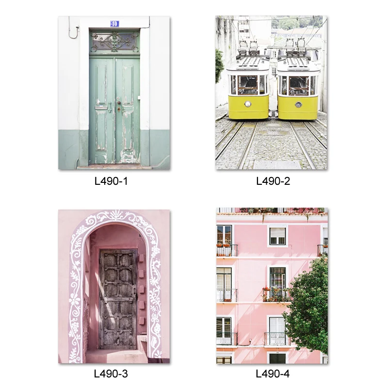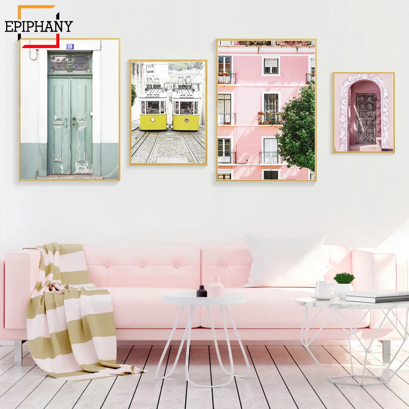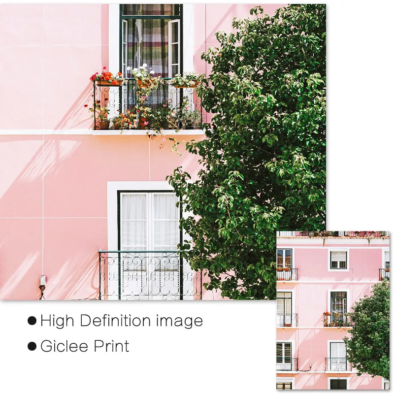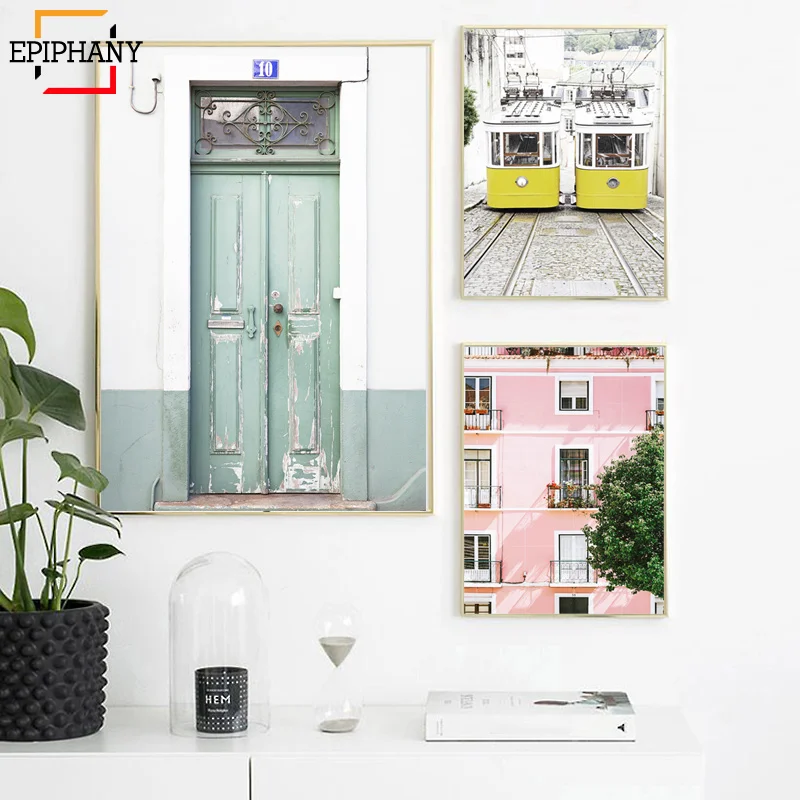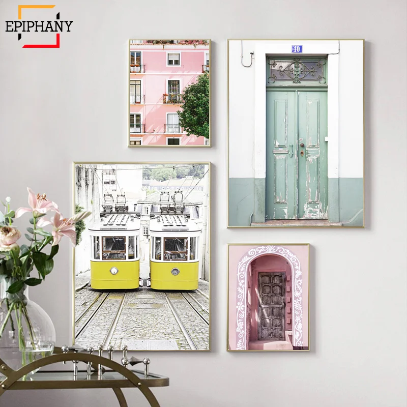 Современная Картина на холсте, розовый дом, городское искусство, дорожная фотография, пастельные тона, настенное искусство, марокканская дверь, Лиссабон, постеры и принты