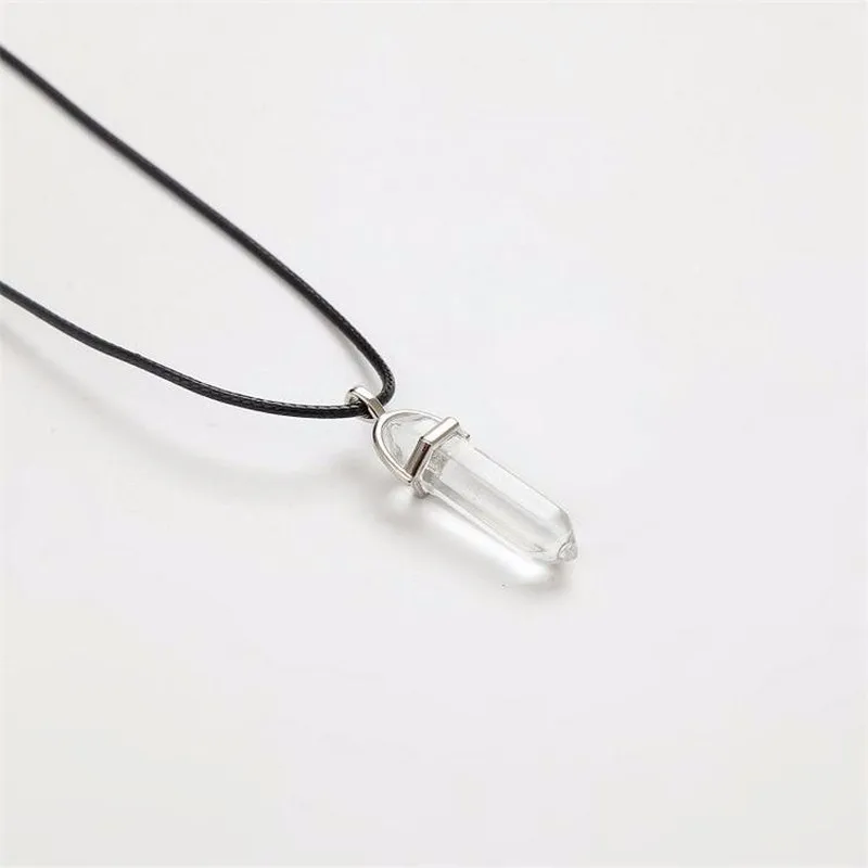 Женская цепочка из кожаного шнура, шестигранная подвеска с натуральным кристаллом, подвеска с розовым и белым камнем