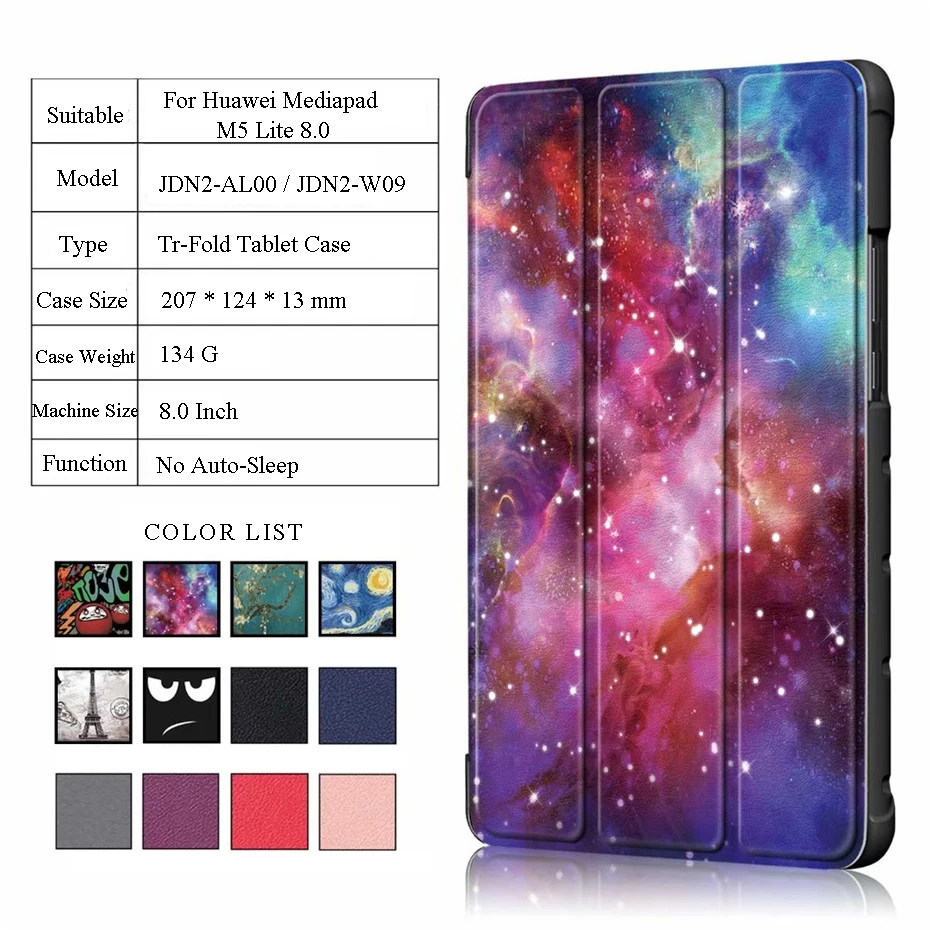 1. Подходит только для Huawei Mediapad M5 Lite 8,0 ''JDN2-W09 JDN2-AL00 2. Материал: высококачественная искусственная кожа + PC 3. Цвет: цветной принт/сплошной цвет 4. Характеристики: подставка и полная защита 5. Стиль: модный, простой и роскошный 6. Содержит: 1 чехол + 1 защитный чехол Этот чехол conner имеет магнит, но не имеет функции автоматического сна/пробуждения!