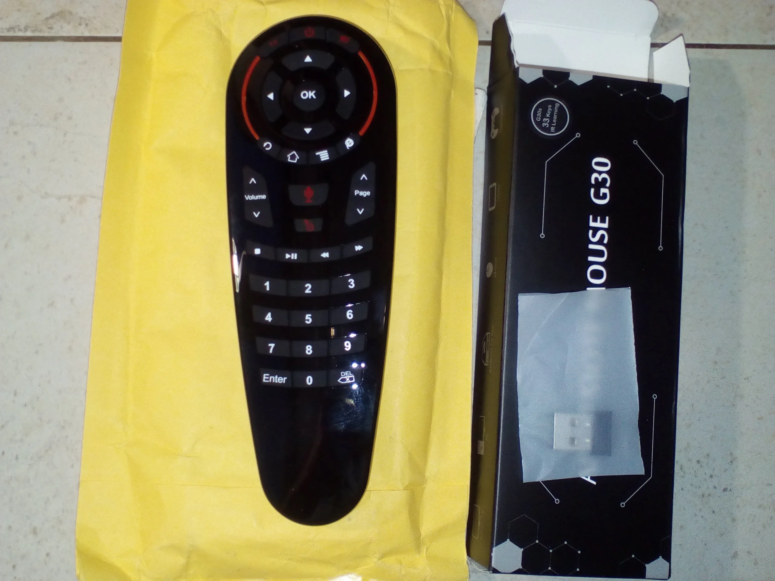 Дошел за две недели. Коробка была помятой ,но пульт целый. В отсеке для батареек лежал адаптер донгл. Кнопки программируются. Голосовое управление работает. Жалко нет подсветки кнопок. Подсвечиваются только две которые используются для программирования . Да и то подсветка как-бы под кнопками надписи не видно.